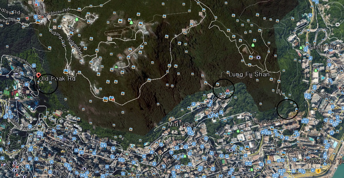 나는 두 지점을 통해서 피크로 걸어올라가보았는데 구글 어스를 통해서 찾아보니 홍콩섬 북서부에서는 총 세군데에서 시작할 수 있는 듯 하다. 홍콩대 근처에 두군데가 있으며 한군데는 센트럴에 조금 더 가까이 있다.