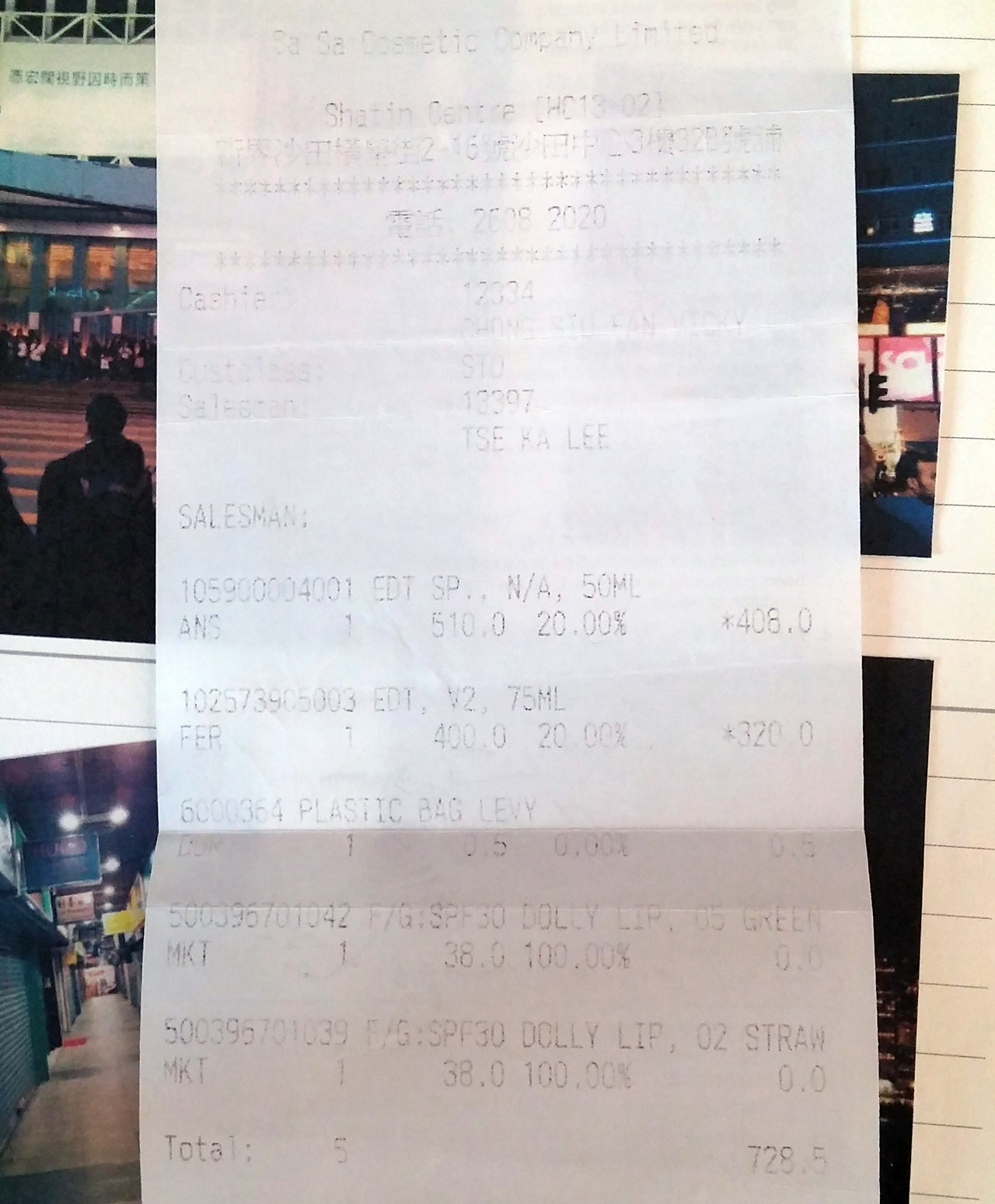 홍콩 여행을 즐기는 분들이라면 아시겠지만, 어딜가나 'SASA'라는 가게가 눈에 띈다. 우리나라로 치면 올리브영 정도 될 것이다. 각종 화장품과 향수 등을 저렴한 가격에 파는 덕분에 현지인들에게 인기가 아주 많다. 하지만 너무 저렴한 가격 탓에 진품이 맞을까 의심이 가기도 한다. 때마침 내 가방에는 페라리 라이트 에센스 향수가 들어 있었다. 진위 여부를 확인하기 위해서 SASA의 것과 향을 비교해 보기로 했다. 왼쪽 손목에는 SASA의 샘플 향수를, 오른쪽 손목에는 내가 들고 간 향수를 조금씩 뿌린 뒤 시간이 지날 때마다 향을 비교해서 맡아 봤다. 사실 무슨 의미가 있겠나 싶지만 선물을 할 건데 혹시 가짜라고 해도 향은 비슷해야하지 않을까 싶어 차린 최소한의 예의였다. 약 3시간 정도 건물 안을 돌아다니면서 생각이 날 때마다 손목에 코를 대어 보니 향은 다른 것 같지 않다. 그렇게 쪼르르 SASA로 다시 쫓아가 거의 4일치 밥값에 가까운 거금을 주고 구입한 향수. 진품인지 여부는 아직도 오리무중이지만 동생은 지금도 그 향수를 잘 사용하고 있다.