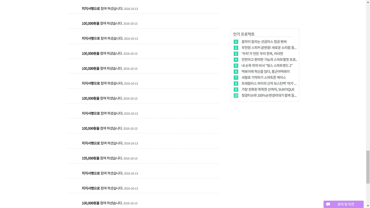 '참여 하셨습니다' 글자 옆에는 그 행동이 일어난 날짜가 있다. 날짜와 일어난 행동을 시작일부터 종료일까지 살펴보면 펀딩이 시작부터 종료할 때 까지 어떤 추이로 모금을 진행하였는지 대략적으로 그려볼 수가 있다.