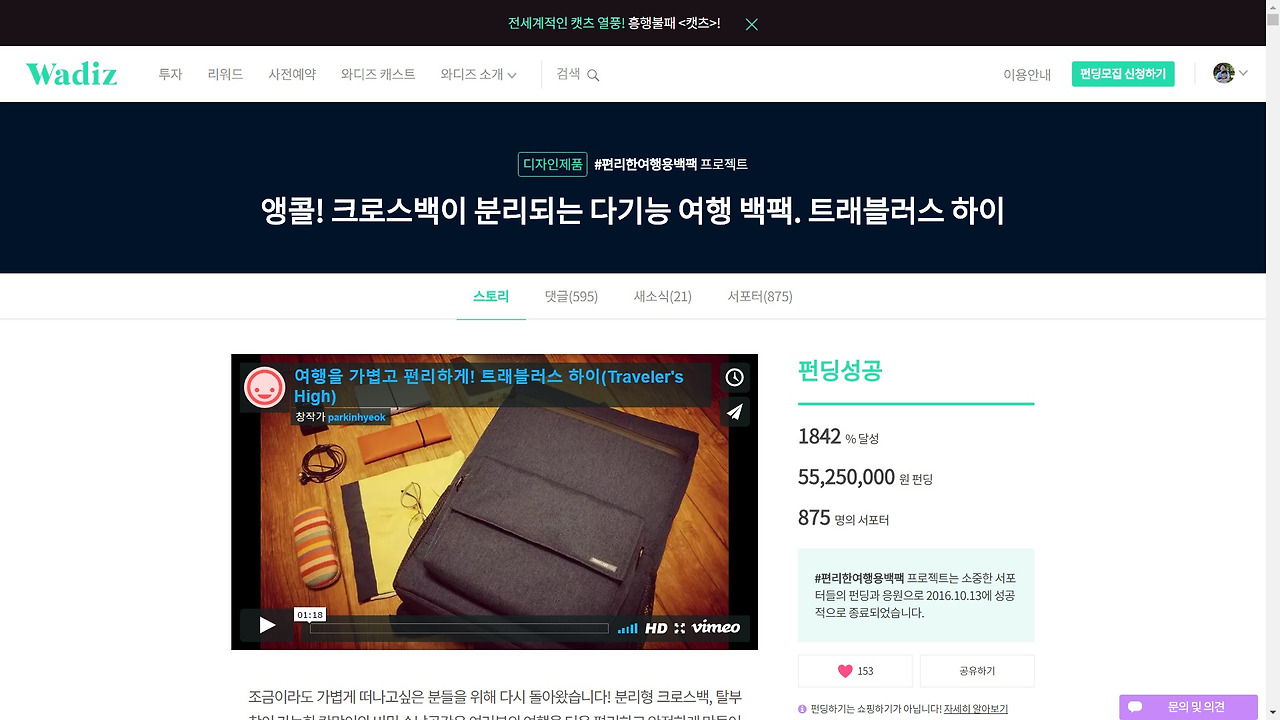 위의 펀딩은 조금 전과 마찬가지로 나의 두번째 펀딩이다. 여기에서 주의깊게 살펴보아야 할 것은 '영상, 스토리, 댓글, 새소식, 서포터' 네가지이다. 그렇다. 전부 다 주의깊게 살펴보아야 한다. 그런데 그냥 살펴보는 것 만으로는 부족하다.