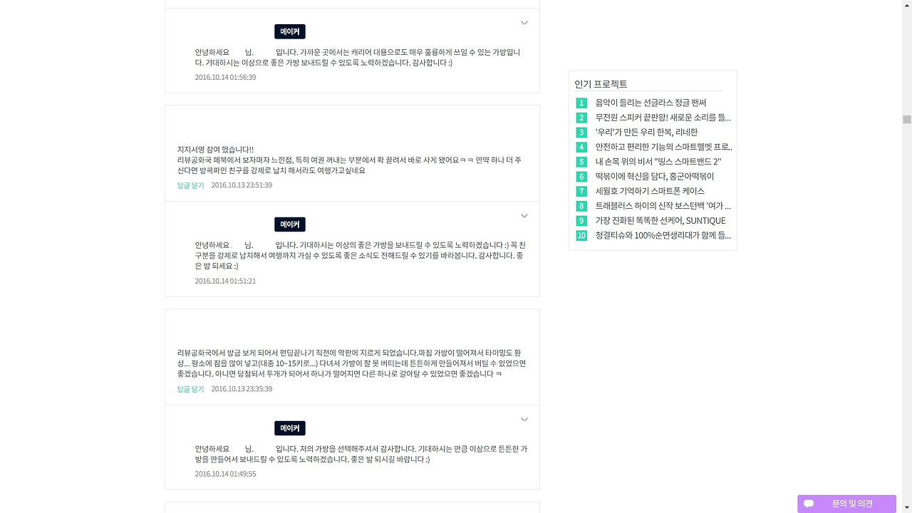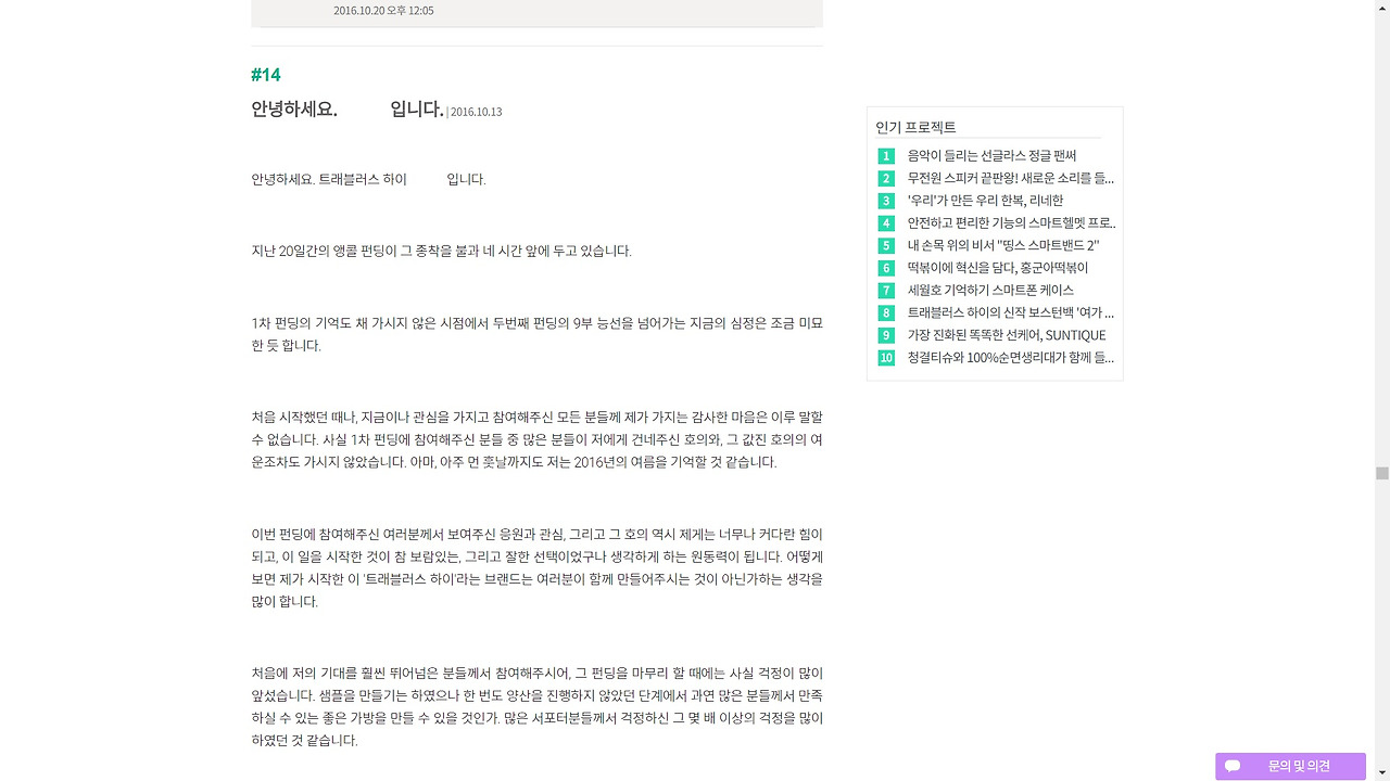 모든 펀딩 플랫폼들이 새로운 소식을 업데이트 할 수 있는 게시판을 가지고 있다. 이곳에서는 펀딩을 진행하는 메이커들이 펀딩의 진척사항을 공유하기도 하지만, 여러가지 감사 인사를 올리기도 하는 곳이다.