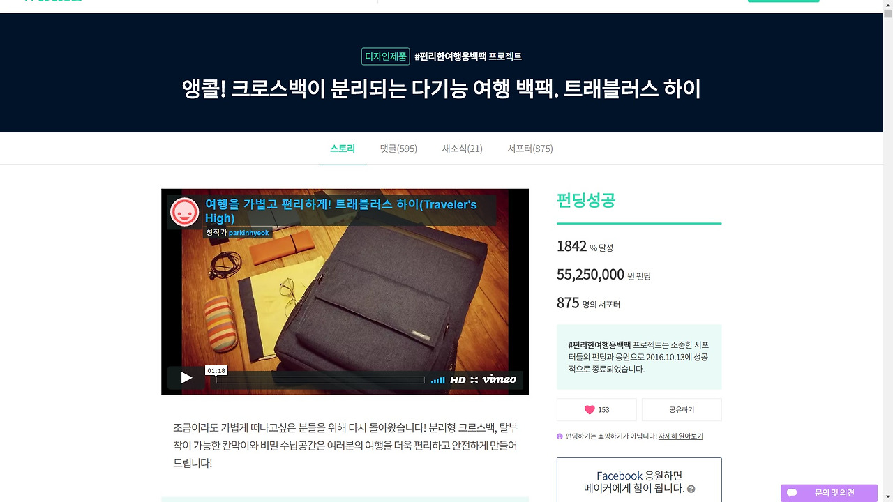 나는 백팩을 기획하는 단계에서 킥스타터와 와디즈에서 '백팩'이라는 이름으로 진행된 거의 모든 제품들을 살펴보았다. 그리고 그 중에서 내 제품의 컨셉과 유사하면서 펀딩 성과가 좋았으며 매우 좋은 제품이라 생각했던 것들을 추려내어 분석하고, 정리를 하였다.