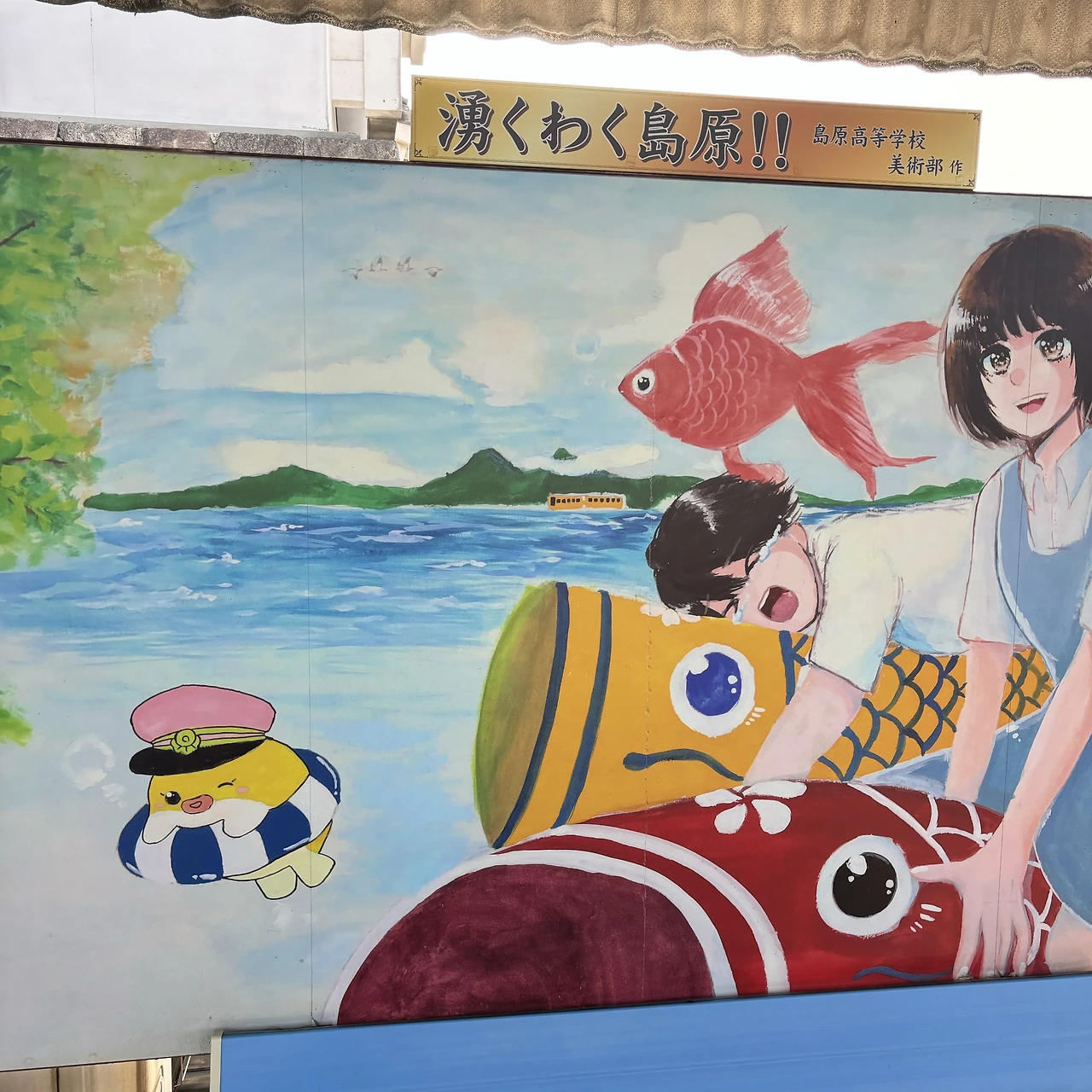 시마바라 역은 잉어 역장으로 유명한 역인데, 지금은 역무원에게 물어보니 그 잉어는 몇 년 전에 치우셨다고. 역장님이 다시 올진 나도 잘 모르겠다. 하지만 그 흔적은 역 내에 곳곳이 남아있다. 아직 인형이나 그림 형태로 남아있다. 그 잉어 역장을 사진으로 보면 황금빛 도는 잉어인데 이렇게 그려놓으니 물고기 같지 않고 귀엽다.