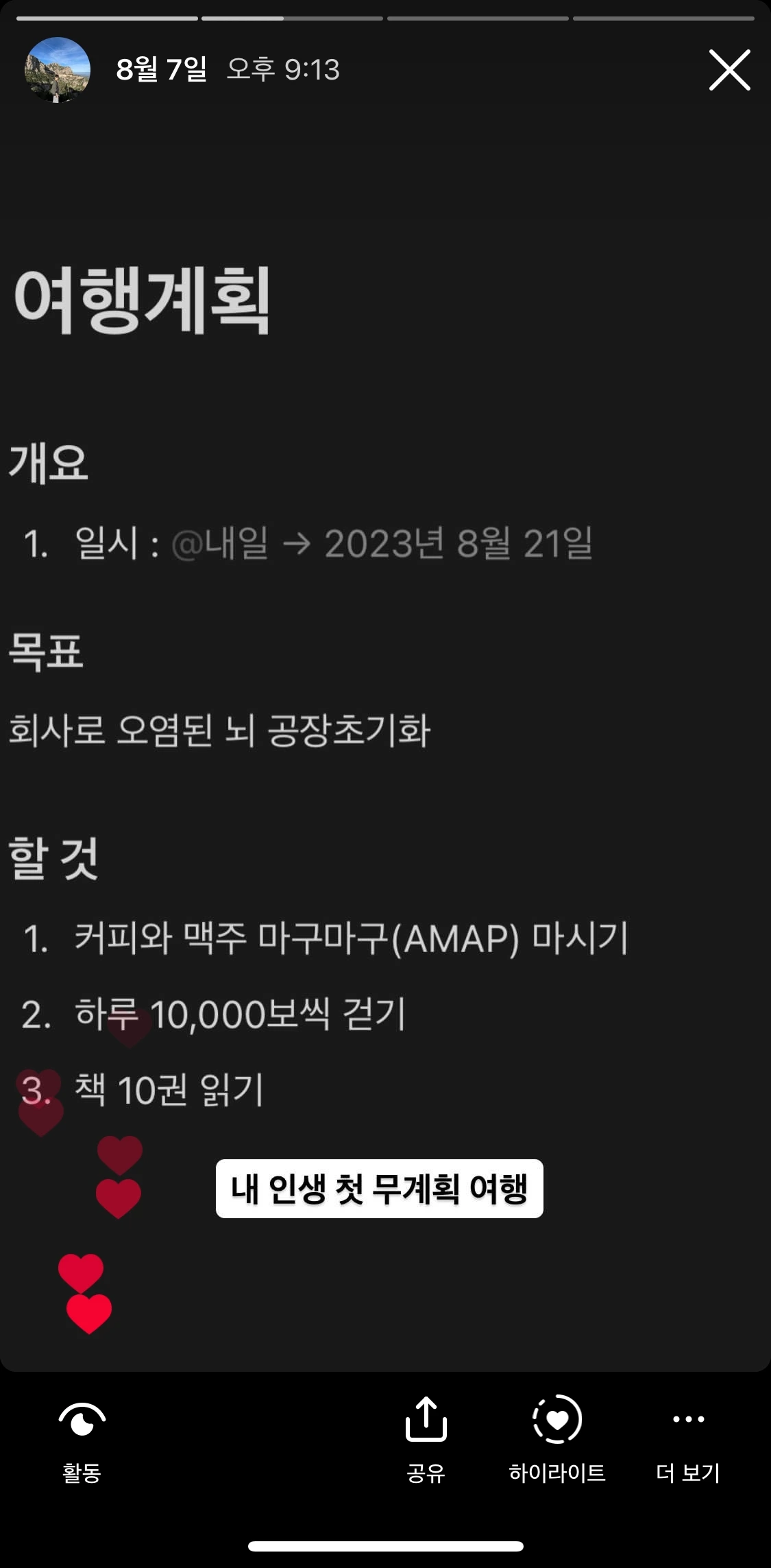 이렇게 정하고나서 여행 출발하는 날 아래와 같이 인스타 스토리에 올렸습니다. 일종의 떠벌림 효과에요. 1만보 걷기나 책 10권 읽기는 어느정도 인증이 가능한 요소니까요. 정말로 저건 지킨다, 그대신 자유롭게 여행한다를 스스로에게 다짐하고 친구들에게 확인받는다 라고 보면 좋을 것 같아요.