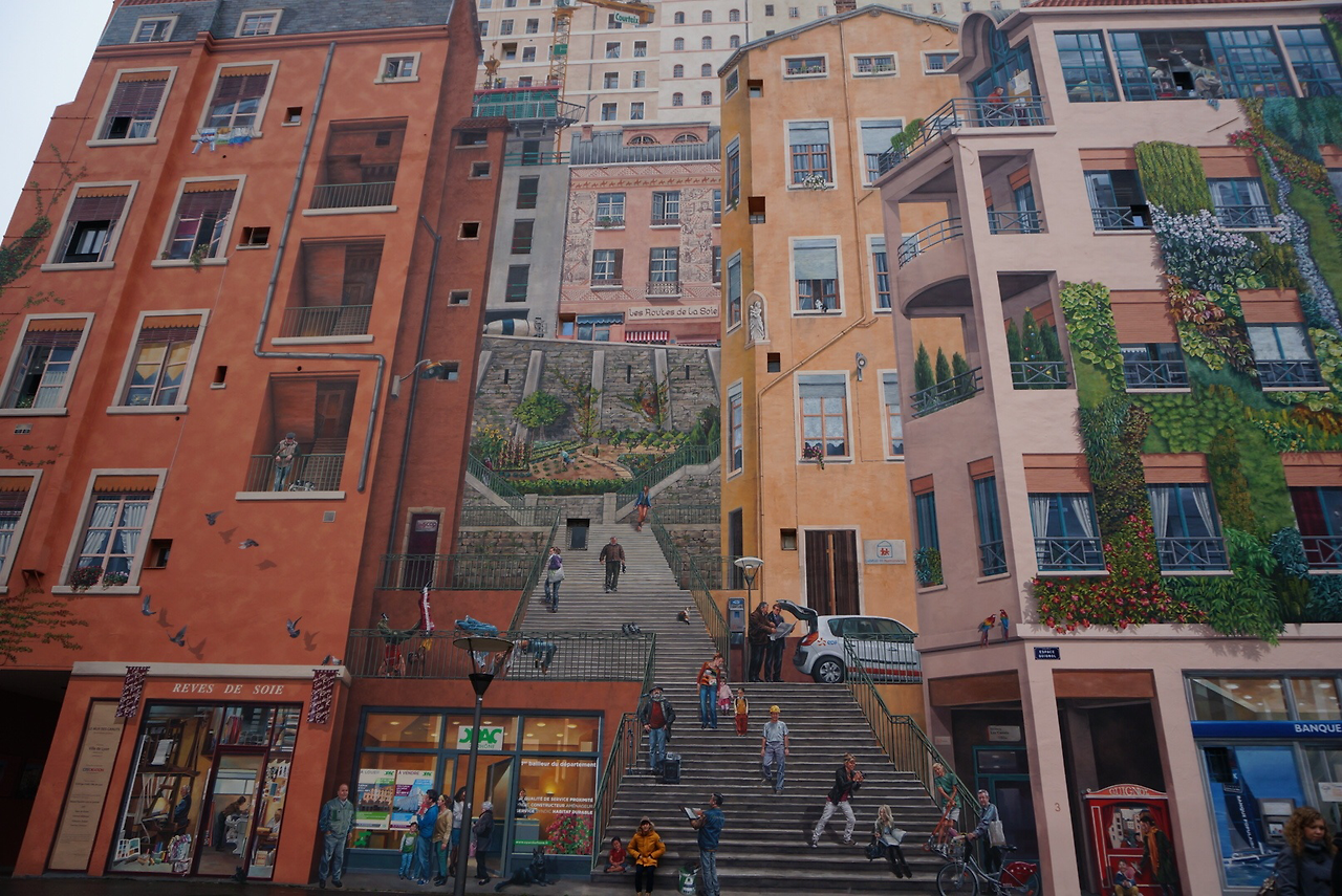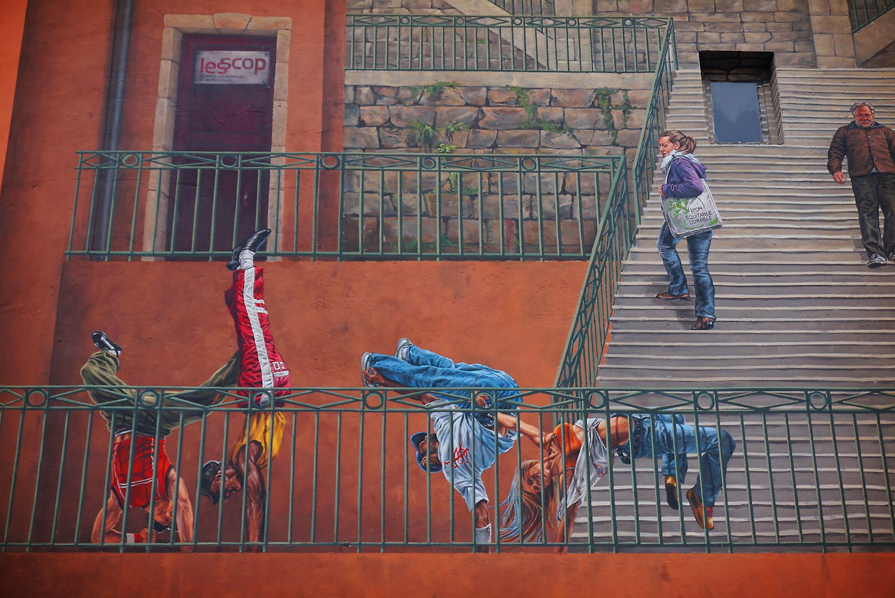 건물 벽화가 있다고 해서 찾아간 곳들이다. 더 있다고 하는 것 같지만 찾지 못해서 큰 곳은 두 군데만 찾아가 봤다. 그런데 이곳을 보는 순간 정말 입을 다물지 못했다. 그 이유는 벽화의 크기에서도 압도가 되고 벽화 그림의 퀄리티에서도 한몫을 한다. 마치 진짜 인 것 마냥 그림을 너무 잘 그러놨다. 이렇게 건물 벽화를 그리게 된 이유는 그려놓은 곳에 건물을 지을 수 없으며, 그 벽면에 아무것도 창문도 없다 보니 너무 휑해서 그림을 그렸다고 알고 있다. 그래서 건물 한 벽면 전체를 그림을 그리다 보니 크기가 어마어마하게 됐다. 그곳에 가보면 그림이 처음 생겼을 때와 점차 그림이 변하는 것들을 전시해놨는데, 점점 퀄리티가 좋아지는 것을 볼 수 있었다. 그리고 다른 건물 이서는 유명한 사람들의 모습을 볼 수 있었다. 일반 사람들이 가장 많이 알고 있는 생떽쥐베리와 어린 왕자도 같이 볼 수 있었다. 커다란 그림이 있다 보니 자연스럽게 장난도 많이 쳤었다.