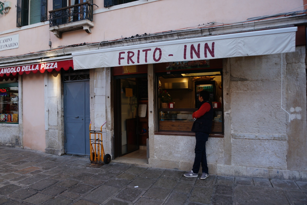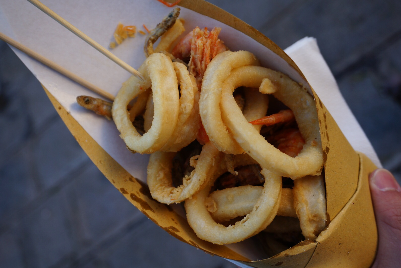 무라노 섬과 부라노섬에서 배가 고픈지 모르고 돌아다니다가 다시 본 섬으로 돌아오니 급격히 배가 고파져서 간단한 요기 거리를 찾다가 찾은 해산물 튀김집이었다. 한국인들에게 유명했기에 그곳에서는 한국분들을 볼 수 있었는데, 가게 안에서 먹는 것보단 걸어 다니면서 먹는 것이 편했기에 들고 다니면서 먹었다. 해산물은 멸치 같은 작은 생선, 오징어 그리고 작은 새우를 튀긴 것들과 짭짤하게 간이 돼있어서 맛있긴 했지만 혼자서 다 먹기에는 조금 느끼했었다. 그리고 그 느끼한 맛을 없애려고 근처에 있는 젤라토 그롬을 먹었는데, 이 젤라토 집은 도쿄에서도 먹는 적이 있어서 이곳 또한 맛있게 먹었다.