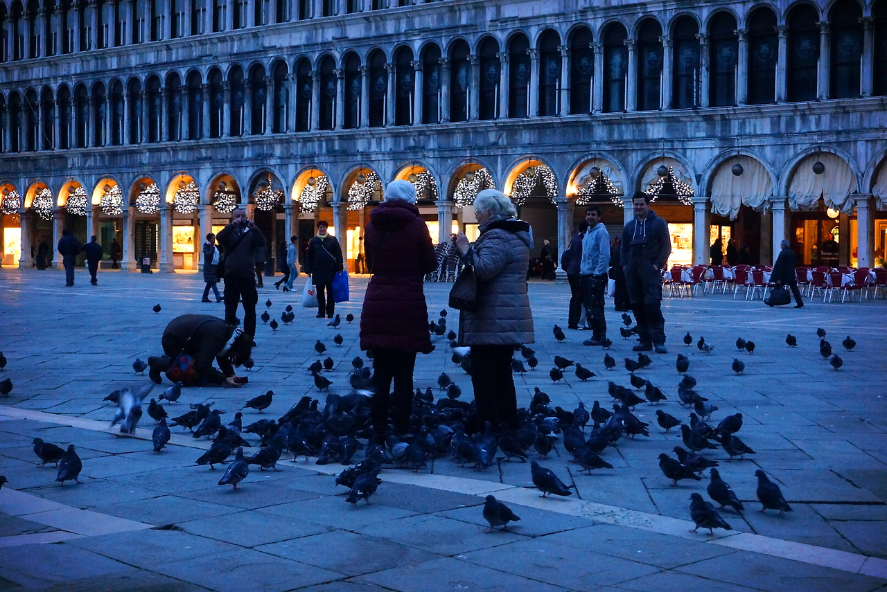 숙소에 잠시 들려 휴식을 하고 해가 지기 전 길거리로 나와 거리를 걸어봤다. 가장 먼저 리알토 다리에 올라가 베니스 풍경을 바라보고 난 뒤 수상버스를 타고 산마르코 광장으로 이동했다. 산마르코 광장은 개인적으로 밝을 때 보는 것보다는 날이 어두워지면서 불빛들이 하나둘씩 켜지면서 광장을 더 아름답게 꾸며주는 것 같았다. 이번은 산마르코 광장에 있는 카페를 가기 위해서 잠시 들린 거라고 봐도 되겠지만 그래도 좋은 기억이 남는 것 같았다. 광장에서는 여전히 어디에서나 볼 수 있는 비둘기들이 많이 있었으며, 그 주위에는 사람들이 사진을 찍기도 하고 먹이를 주는 모습들도 볼 수 있었다.