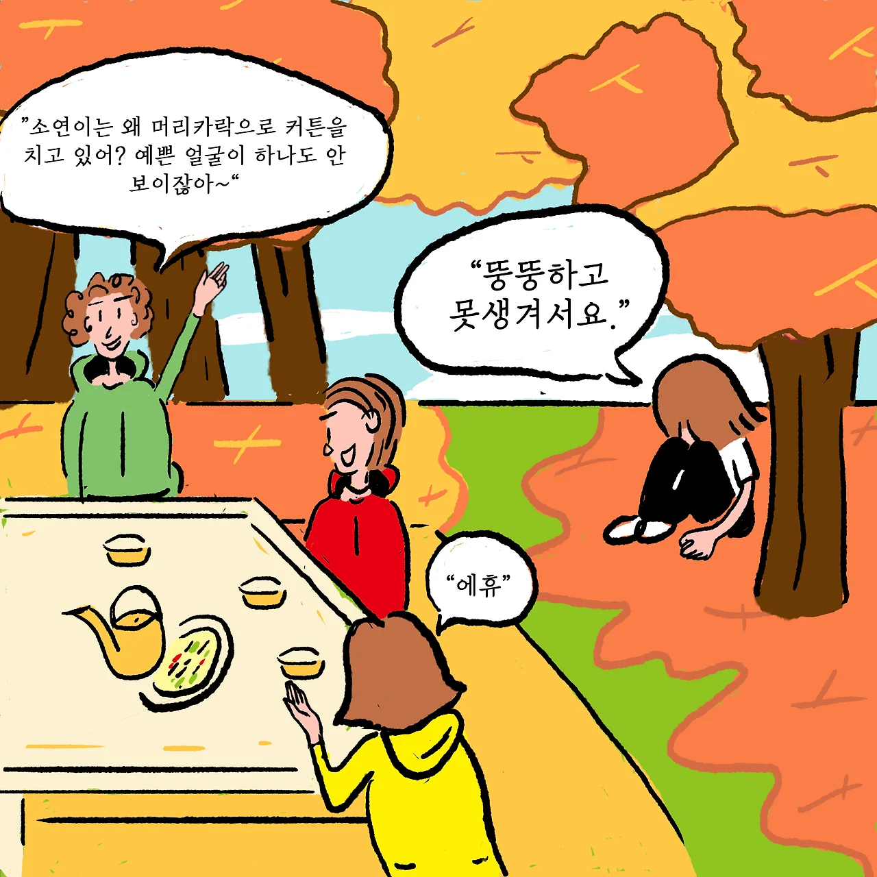 ”소연이는 왜 머리카락으로 커튼을 치고 있어? 예쁜 얼굴이 하나도 안 보이잖아~“