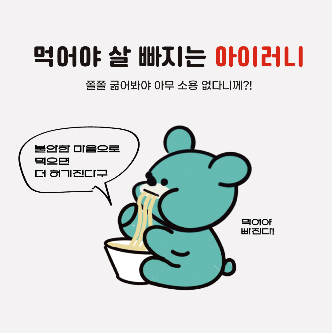 그야말로 '안 먹어서' 문제가 발생하는 예시이고, 수많은 다이어터들이 겪고 있는 문제이기도 하다. 물론 정서적 허기에서 오는 심리적인 문제들도 동시에 다루어야 하지만, 그전에 식단부터 먼저 점검하는 첫 번째 단계에 해당하는 내용이라고 이해하는 것이 적절하다.