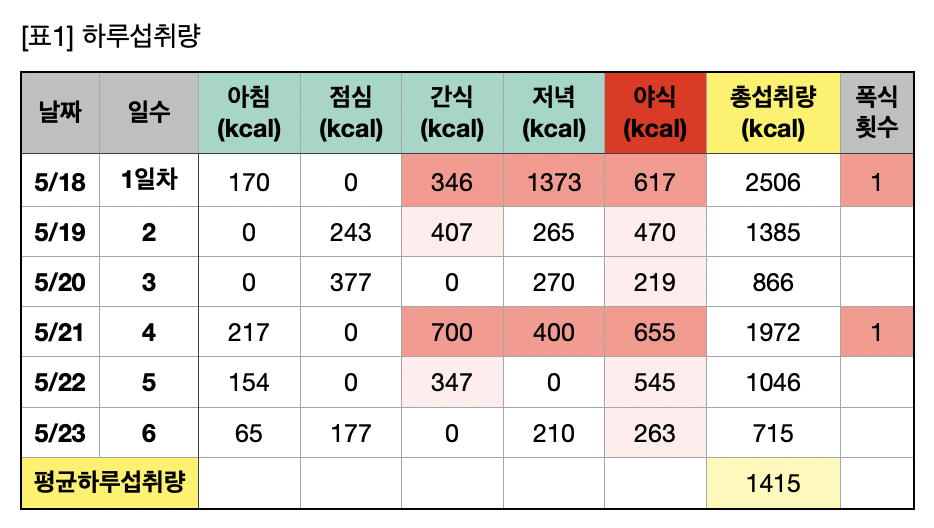 유색처리해 놓은 부분은 식사가 아닌 것들을 이것저것 주워 먹은 식단이다. 전체 끼니 21 끼니 중 간식으로 채운 식사가 11 끼니로, 절반 이상을 차지한다. 이러한 식단은 열량만 채울 뿐, 포만감과 영양 모두 채울 수 없는 식단이다. 오히려 먹을수록 허기가 더 지고, 먹고 싶은 욕구만 더 생긴다.
