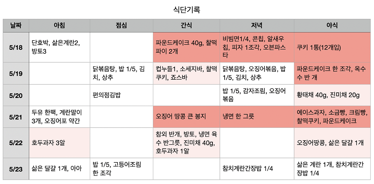 기록에는 시간까지 나타나있지는 않지만, 시간이 일정하지 않고 아무 때나 먹은 것이 특징이다. 야식은 주로 10시 이후 아주 늦은 시간이다.