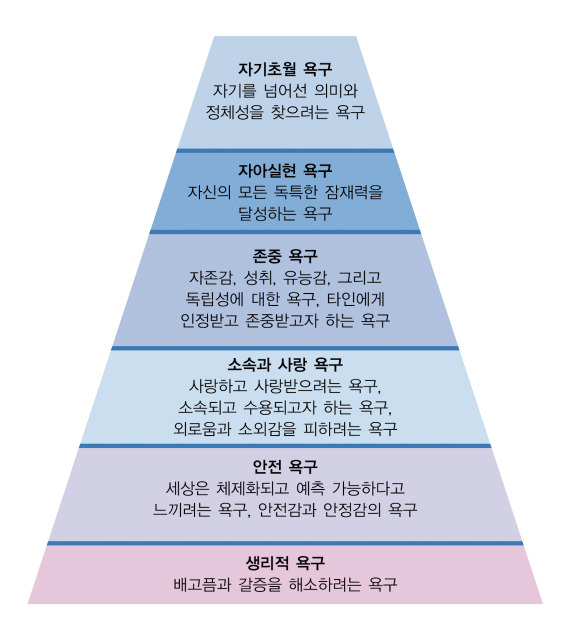 간단하게 정리하자면, 매슬로우는 먹고 자는 것과 같은 기본적인 욕구가 충족되면 차츰 상위의 욕구를 추구한다고 보았고, 최상위의 욕구가 자아실현/자기 초월이라고 보았다.
