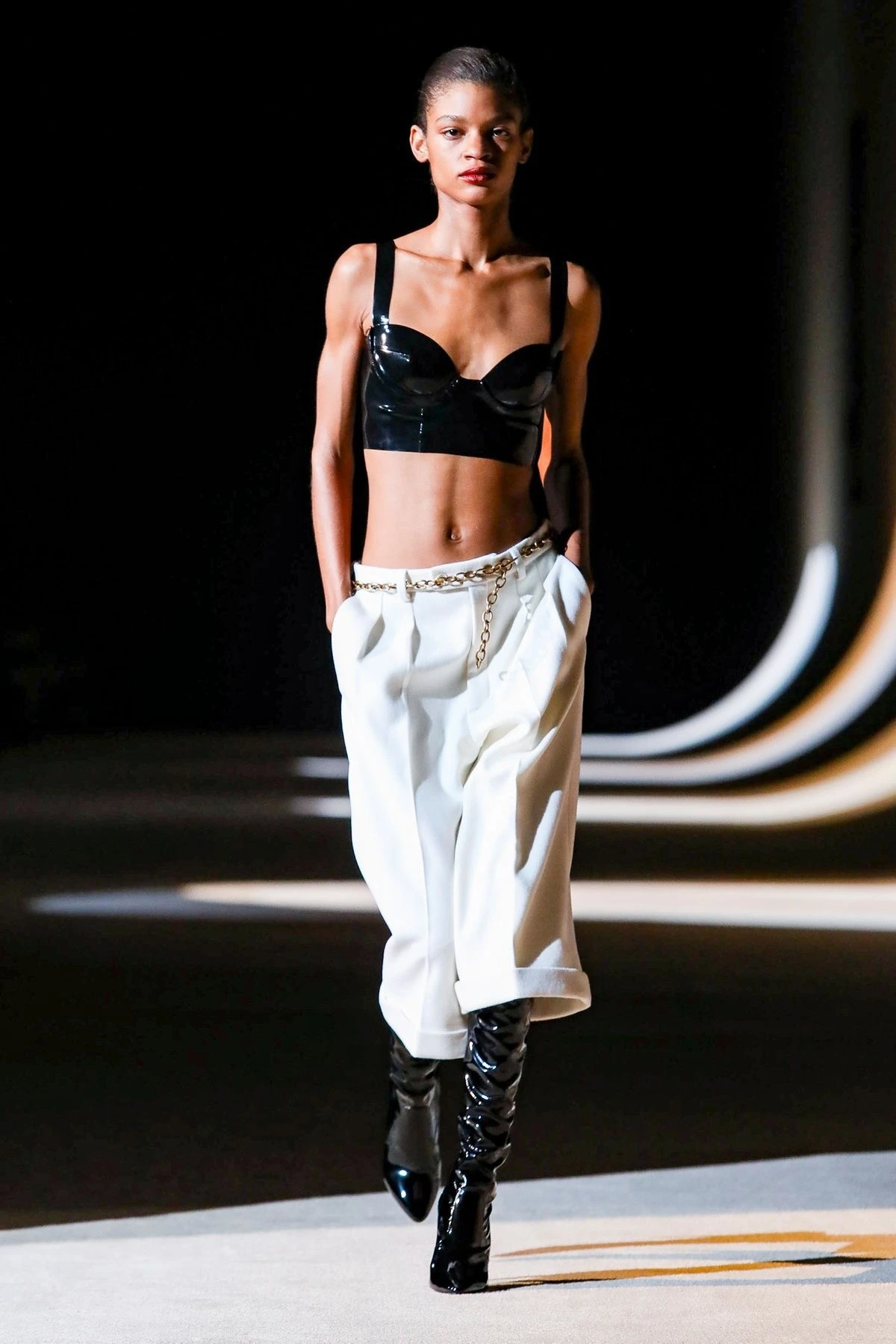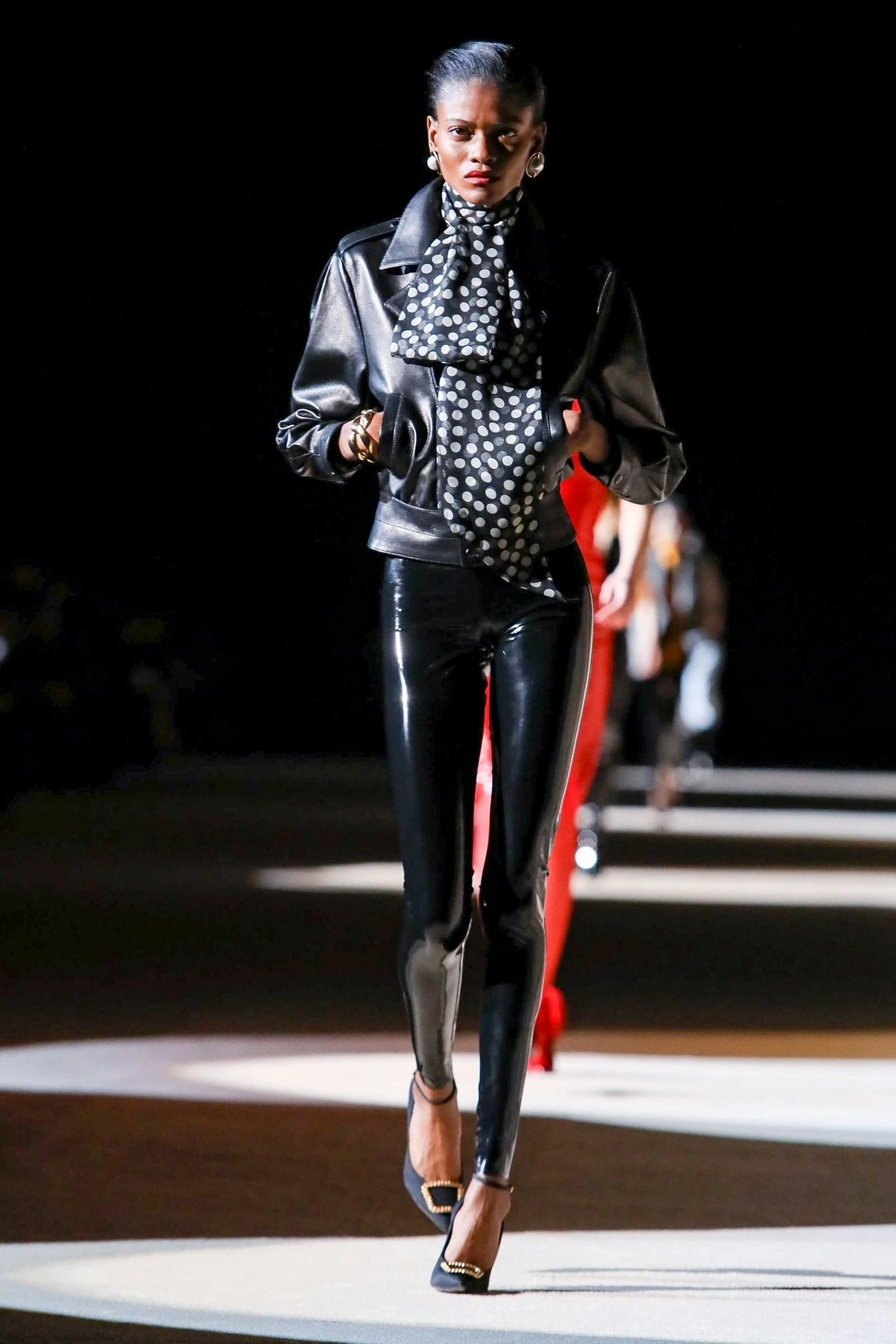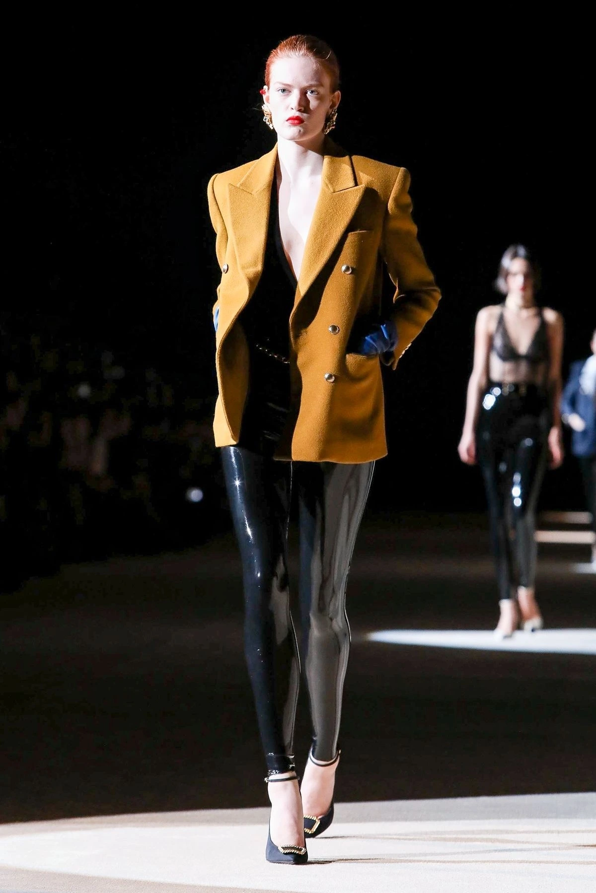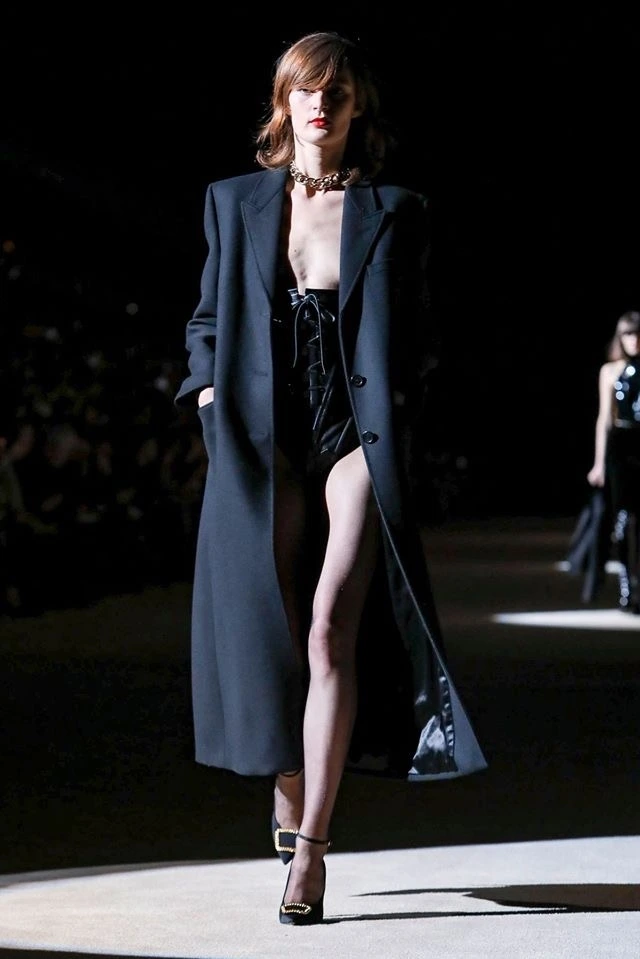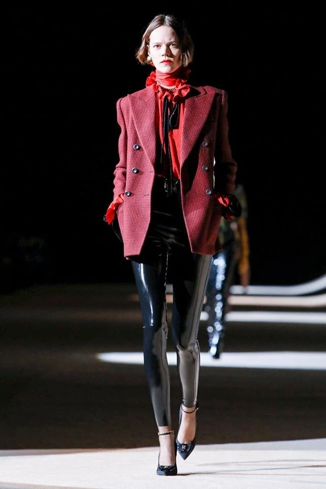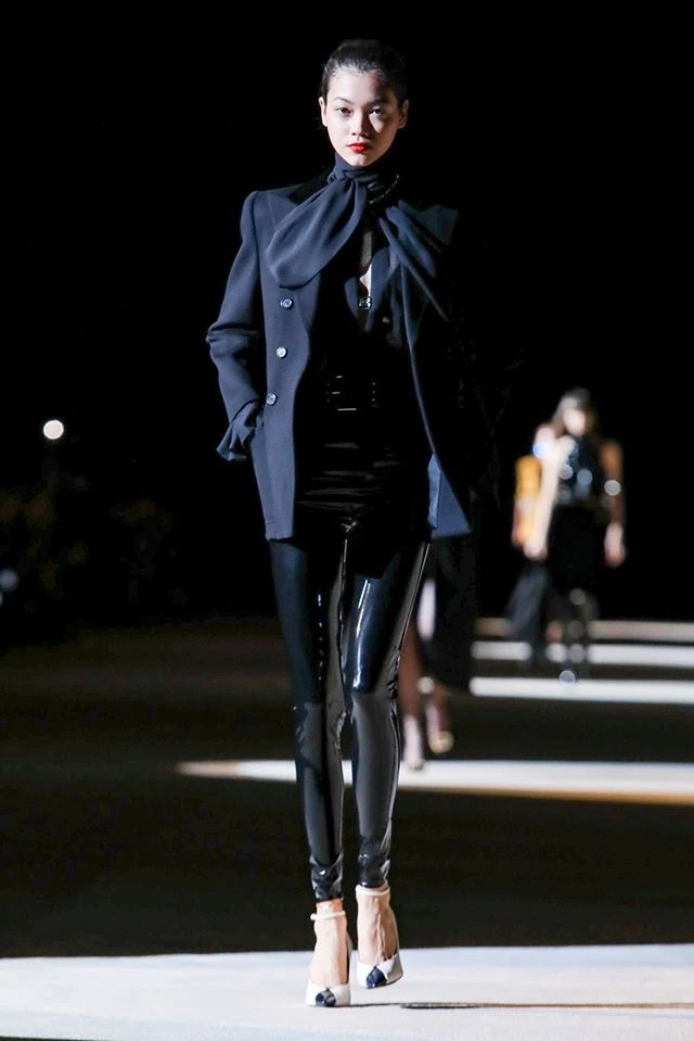 8,90년대 생로랑 히브 고슈의 클래식 부르주아 무드를 담아낸 아우터와 셔츠에 라텍스 소재의 하 의를 매치한 관능적인 룩은 보는 이의 시선을 한눈에 사로잡기에 충분했다.