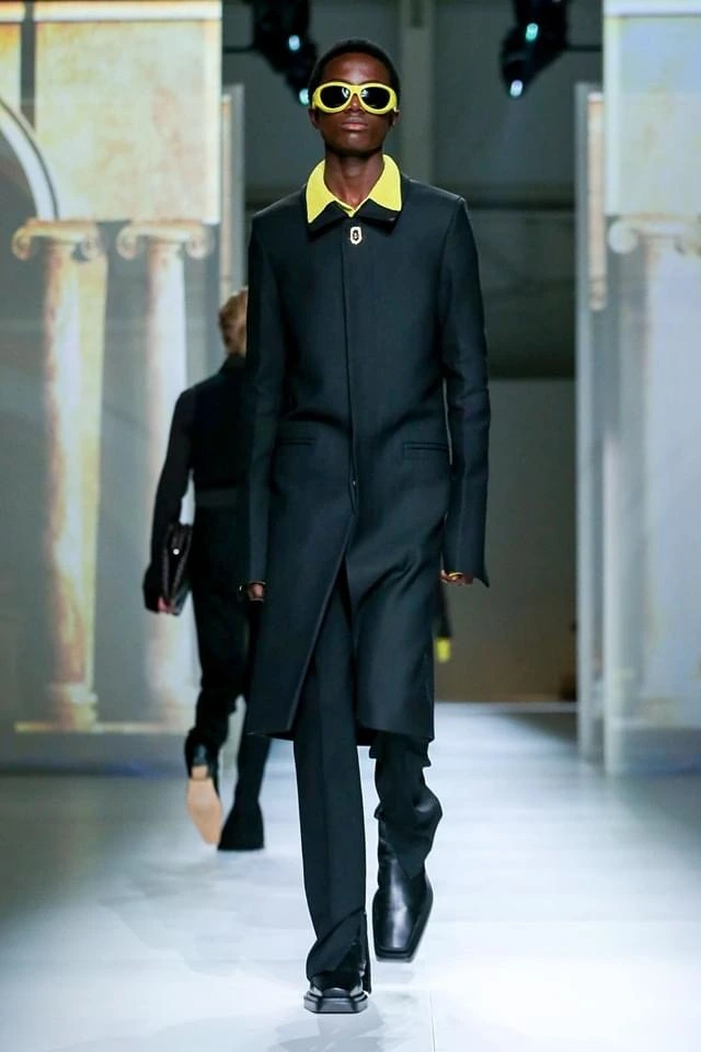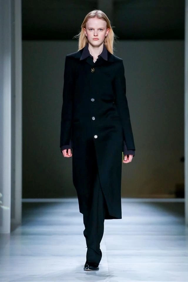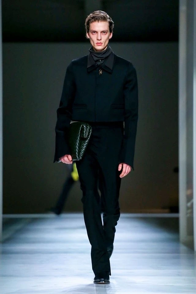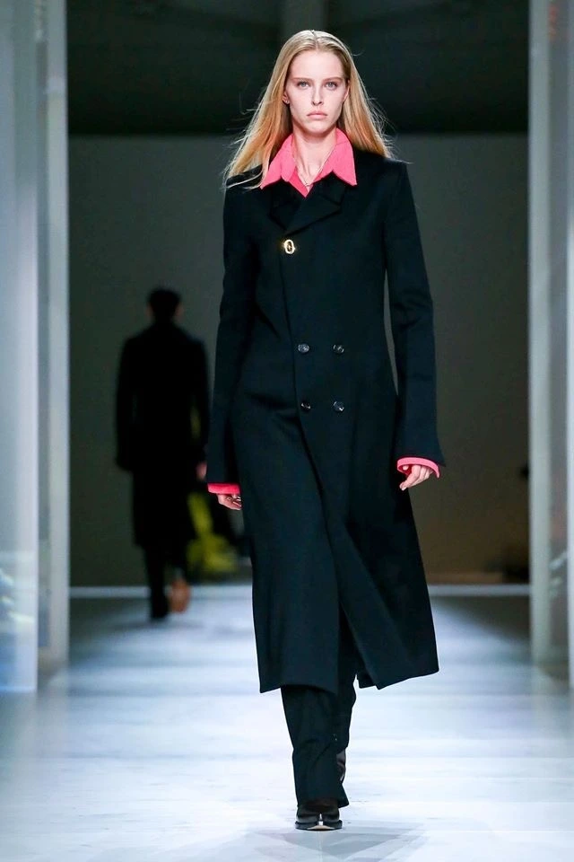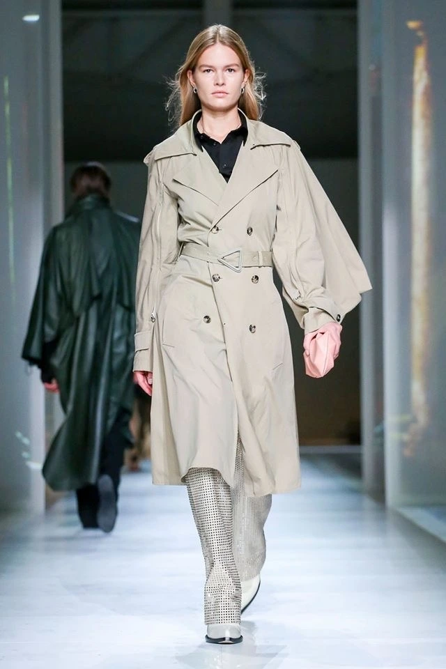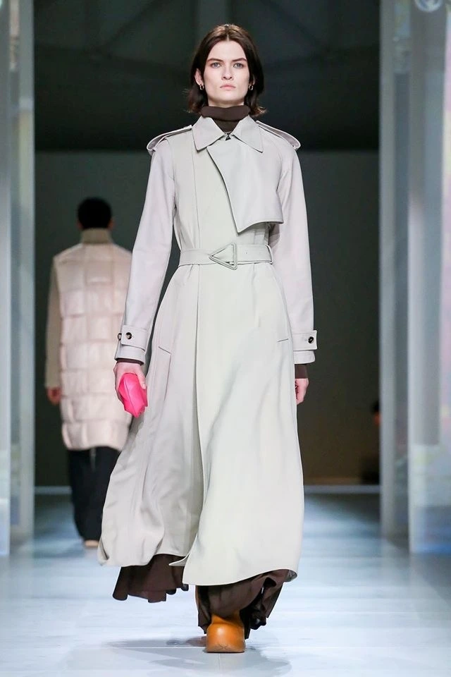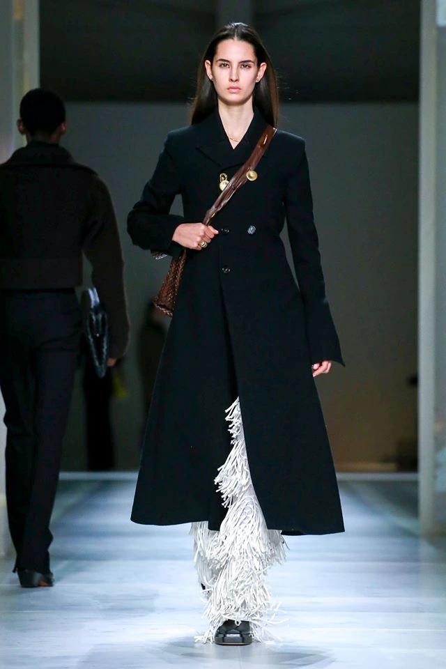 보테가 베네타는 이번 시즌 컬렉션에서 더블브레스트 재킷과 코트를 많이 선보였는데, 옷깃 밑에 단추를 사용한 디테일이 주목할 만하다.
