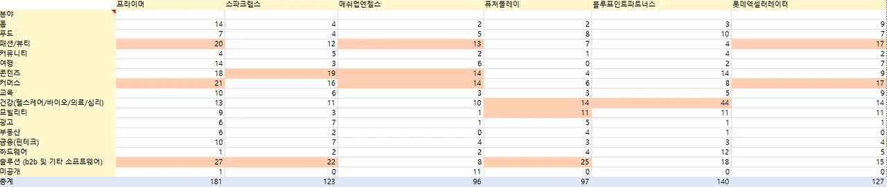 주분야: 솔루션(b2b 및 기타 소프트웨어)(27), 커머스(21), 패션/뷰티(20)