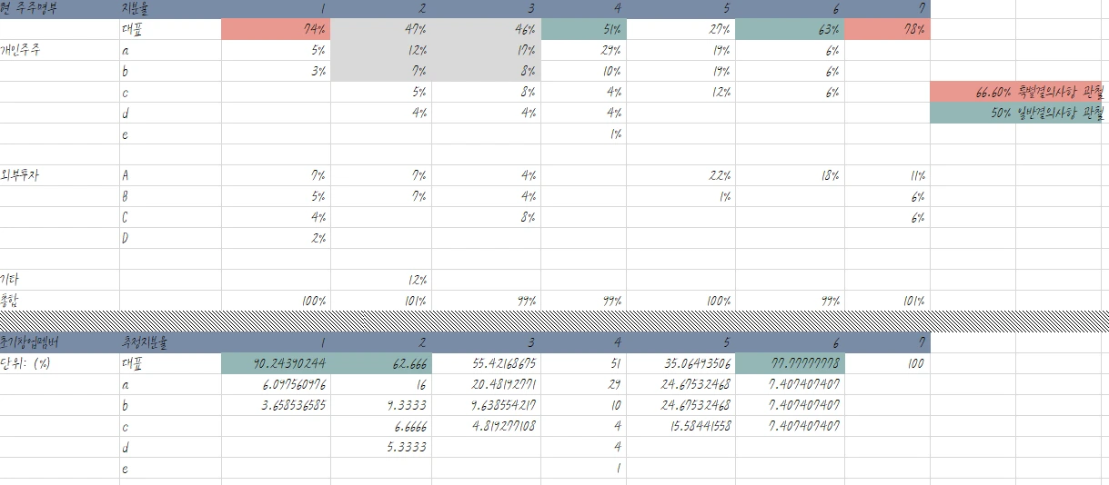 1/2(50%) 초과 : 일반 결의 사항(ex. 이사 선임 관련건) 관철가능