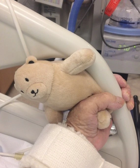 손에 인형을 쥐고 있다가 침대 난간도 같이 붙잡고 있는 환자의 모습(인형을 던지지 않은 걸 보면 마음에 드시나보다 ㅎㅎ)