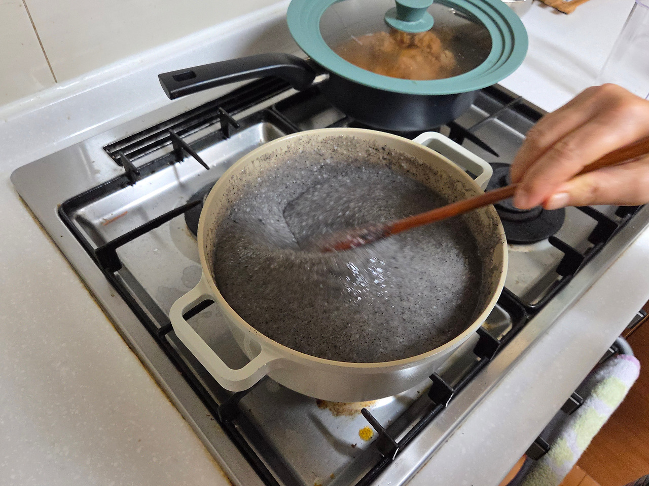엄마는 불려둔 찹쌀과 흑임자 가루를 믹서기에 넣고 2~3분 간 곱게 갈았다. 알알이 씹히는 식감보다 수프처럼 부드러운 걸 좋아하는 나의 취향을 정확히 겨냥한 선택이었다. 곱게 갈린 죽이 냄비로 옮겨지고, 곧 무한한 젓기의 시간이 시작됐다. 보아하니 3인분은 훌쩍 넘는 양이었다. 사랑이 많은 엄마다운 선택이었다. 주말 내내 꺼내 먹을 수 있도록, 넉넉한 마음이 냄비에 넘칠 만큼 담겼다.