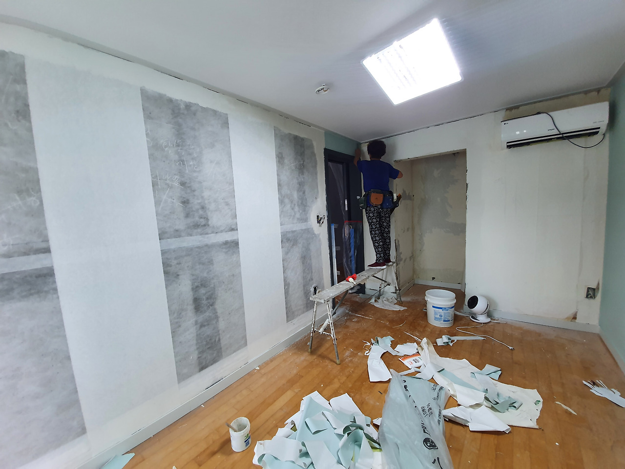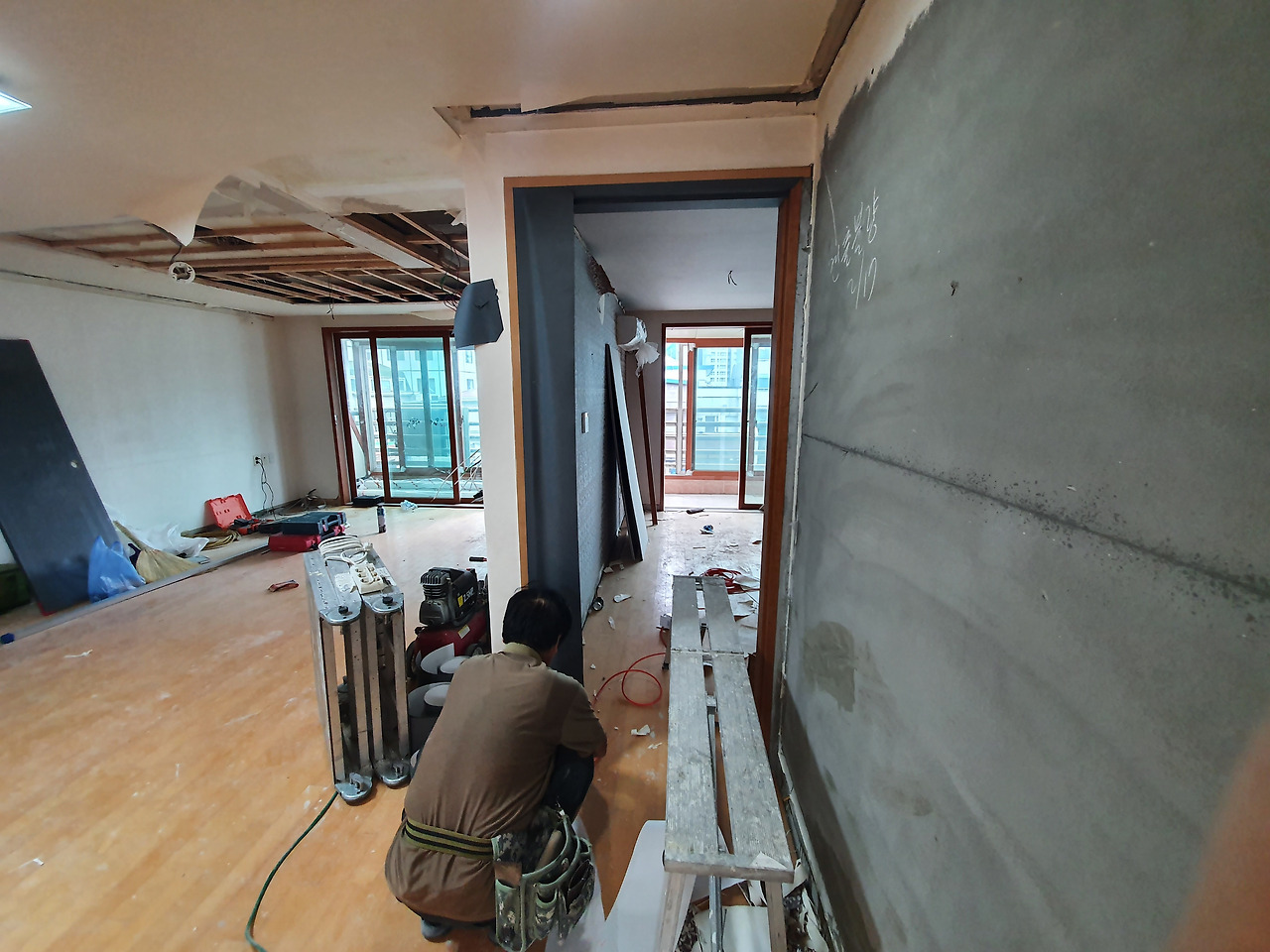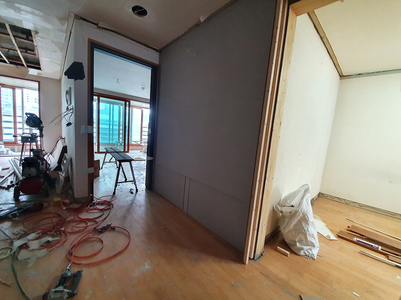 이 작업이 짧으면 이틀, 길면 삼일안에 해결이 되었다면 좋은 출발이라 하겠다. 이 와중에도 고객과의 새로운 미팅을 통해 섀시의 브랜드와 종류 유리의 두께와 손잡이의 모양까지 정하고 주문이 되어 있어야 한다. 또한 목공 작업을 통해 보완해야 할 부분, 천장과 벽 작업을 마무리 하고 고객이 새롭게 만들었으면 하는 부분(이를테면 슬라이딩 도어나 아트월, 포인트 벽의 웨인스 코팅 등.)을 시작한다.