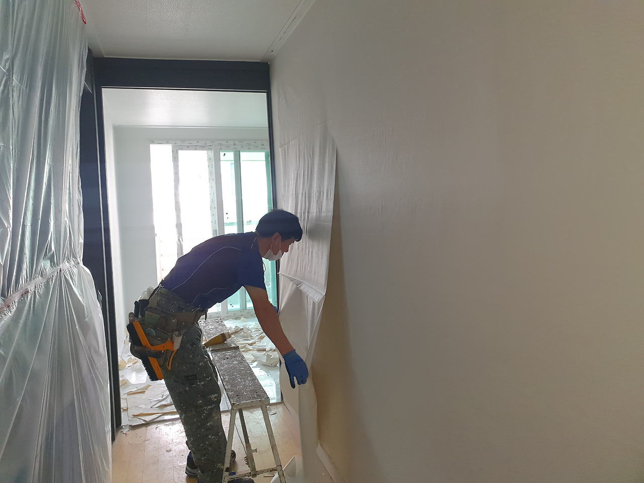 타일 작업 후엔 욕실 세팅을 하고 문을 달아준다. 이 즈음에 도배가 들어올 수도 있다. 도배의 경우 기본적으로 물을 많이 쓰기 때문에 되도록이면 욕실 세팅이 끝난 후나 여의치 않을 경우 동시에 시작한다. 이제 본격적인 마감이다. 30평대 기준으로 도배는 이틀간의 작업시간을 갖는다. 첫날은 밑작업 및 초배지를 바르고 둘째날은 천장부터 시작해 본격적인 벽지작업에 들어간다. 가장 눈에 잘 띄는 공정이기 때문에 신경써서 작업을 해 줘야 한다. 더욱이 도배의 경우 부분 보수가 불가능한 부분이기 때문에 작은 하자도 허용치 않아야 한다.