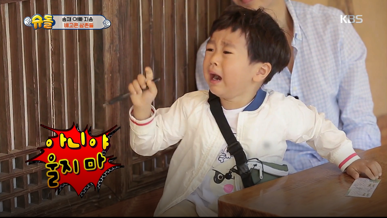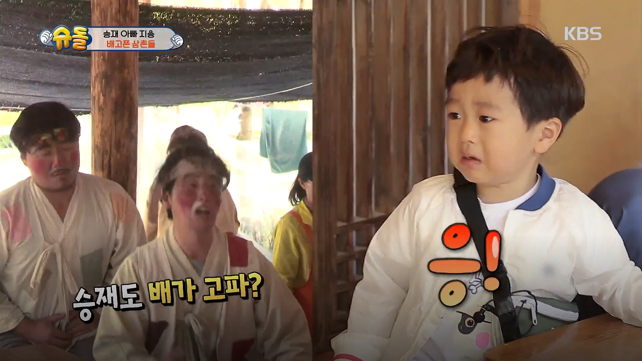 예능프로 <슈퍼맨이 돌아왔다> 영상을 튼다. 민속촌에 놀러 간 고지용과 3살배기 아들 승재가 떠들썩하게 배고프다며 우는 각설이를 만난다. 낯선 아저씨 둘이 울자 승재는 울지 말라며 같이 울어버린다. 오히려 각설이들이 당황한다. "승재도 배가 고파?"라고 묻자 "응!"이라고 답하며 울먹인다.