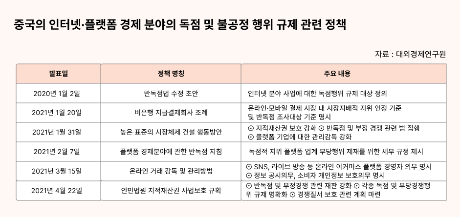 중국은 이미 비슷한 법안을 도입한 경험이 있습니다. 2021년, 중국 정부는 '플랫폼 경제를 위한 반독점 지침'을 도입하여 플랫폼 기업들의 독과점을 규제하고자 했습니다.