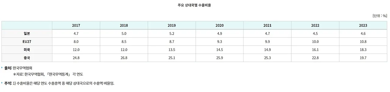 이러한 상황 속에서 수출 중심 경제 구조를 가진 한국은 필연적으로 큰 영향을 받을 수밖에 없습니다. 특히 한국의 제1 수출국이 중국이라는 점은 복잡한 국제관계 속에서 고려해야 할 변수가 많다는 것을 의미합니다. 게다가 트럼프 정부 2기가 확정되며 국제관계는 물론 통상 분야 전반에 걸쳐 많은 변화가 예상됩니다.