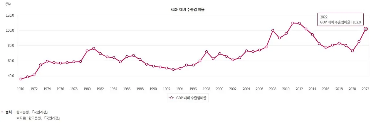 한국은 우리가 익히 아는 것처럼 인구와 국토가 작아 기술 혁신을 통한 대외 수출 중심의 경제 구조를 가진 국가입니다. 2022년 기준 한국의 국내총생산(GDP) 대비 수출입 비율은 102.0%로, 이는 미국(35.7%)이나 프랑스(85.7%), 영국(91.3%) 등 주요 선진국보다 훨씬 높은 수준입니다. 그리고 2024년 10월, 한국의 무역수지는 31억 7천만 달러의 흑자를 기록하며 전년 동월 대비 증가했지만 시장 예상치보다는 낮았습니다.