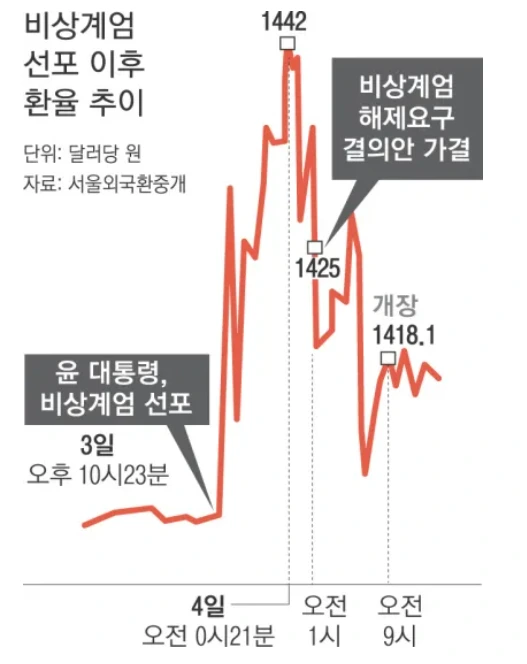 그리고 현재 한국은 비상 계엄과 그로 인한 대통령 탄핵 시위의 여파가 정치권을 넘어 경제에도 영향을 주기 시작했습니다. 계엄군이 국회에 투입되었다는 소식이 전해지자 원달러 환율은 1달러당 1,442원으로 2년 만에 최고치에 달했고, 환율 변동폭 또한 코로나 이후 가장 컸습니다. 또한 비상 계엄 다음 날 주식시장은 KOSPI 지수가 -2% 하락하며 외환시장과 주식시장 모두에 악영향을 미쳤습니다.