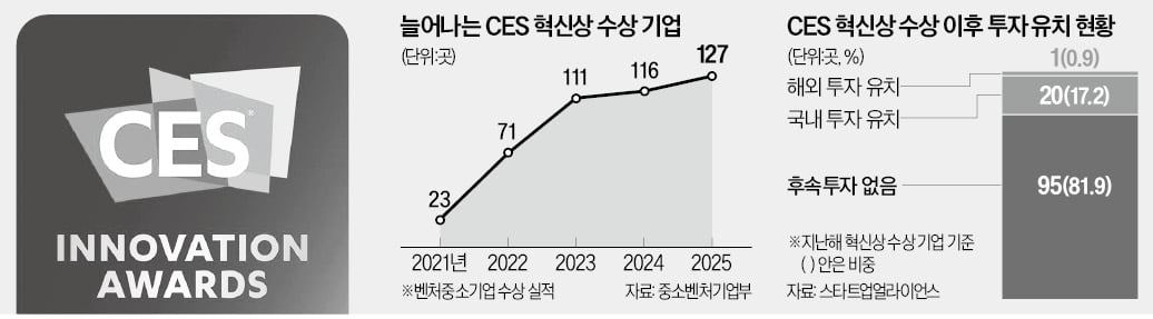 올해 1월 진행했던 CES 2025에서 한국 기업들은 총 129개사가 혁신상을 수상하며, 참가 기업 수 기준으로 역대 최다 기록을 세웠습니다. 그러나 이러한 화려한 수상 실적에도 불구하고, 실제 투자 유치로 이어지는 경우는 극히 드뭅니다.