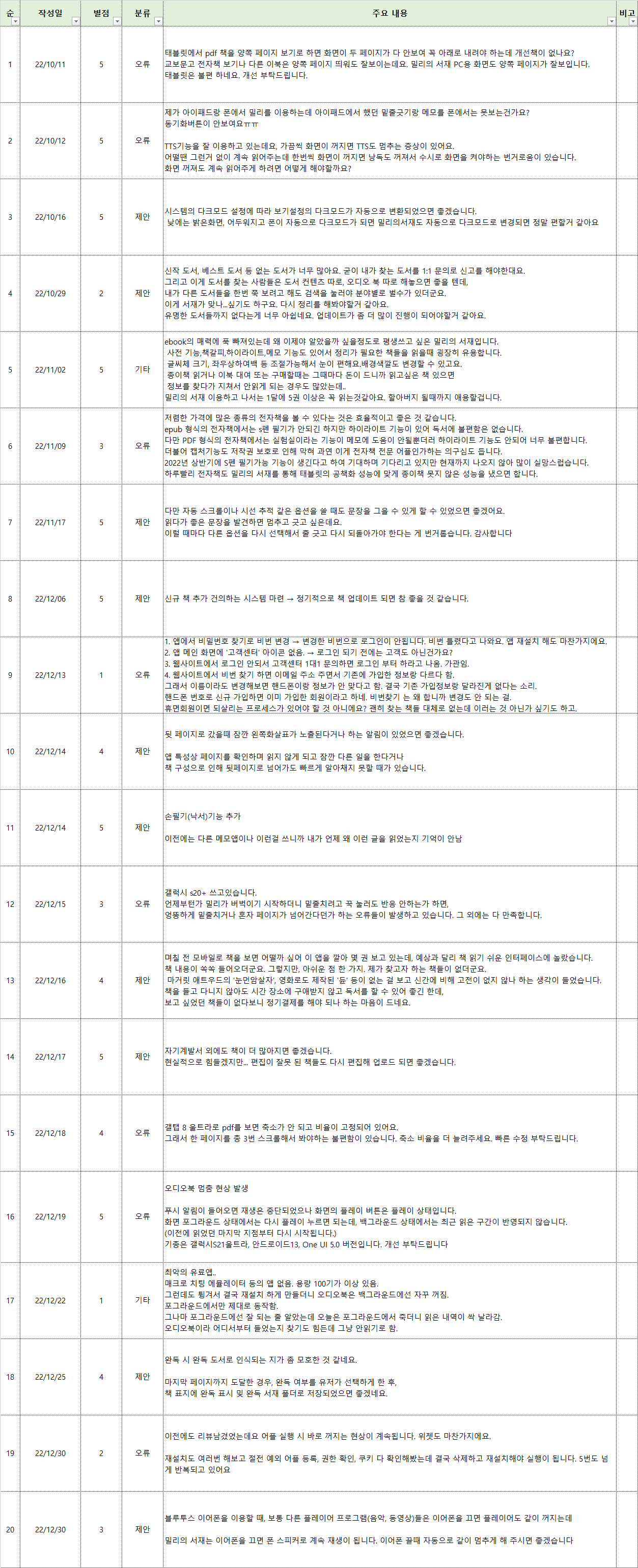 밀리의 서재의 VoC를 확보하기 위해, 구글 플레이스토어에 등록 된 고객들의 리뷰를 추천 순으로 20개를 정리하고 분류하였습니다. 분류 기준은, 밀리의 서재의 핵심기능인 '책을 읽거나 듣는 기능(오디오북)'이 정상적으로 작동하는 지를 기준으로 '오류', '제안', '기타' 총 3가지 기준으로 VoC를 구분하였습니다.