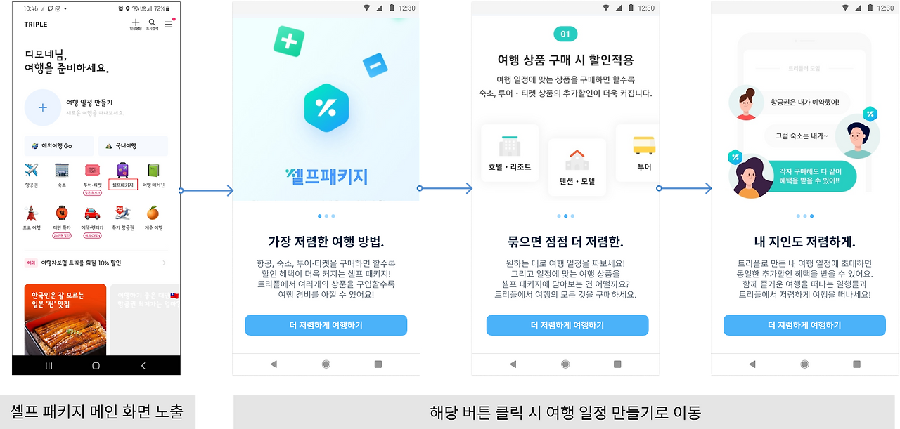 → 첫 화면에 셀프 패키지 버튼을 노출시키고, 설명하는 페이지를 추가한다면, 고객들이 여행 일정도 많이 만들 것이고, 셀프 패키지 이용 건수가 늘어날 것이다.