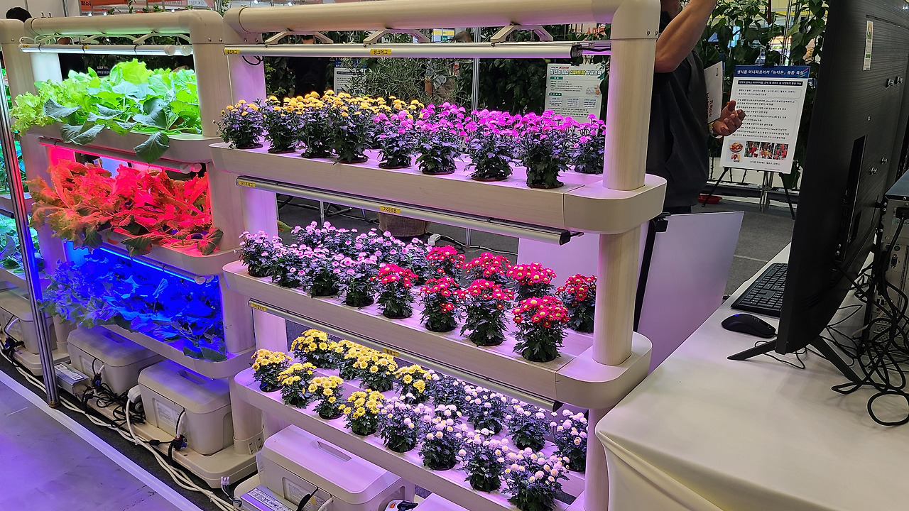 다양한 스마트팜 개발 기업에서 각자의 기술력을 뽐내기 위해 여러 형태로 전시된 스마트팜은 농작물외에도 화훼 등을 생육할 수 있도록 구성되어 있었고, 곳곳에 배치되어 있는 다양한 형태의 스마트팜은 전시관 전체를 자연으로 물들이며 저를 포함한 관람객들의 눈길을 사로잡았습니다.