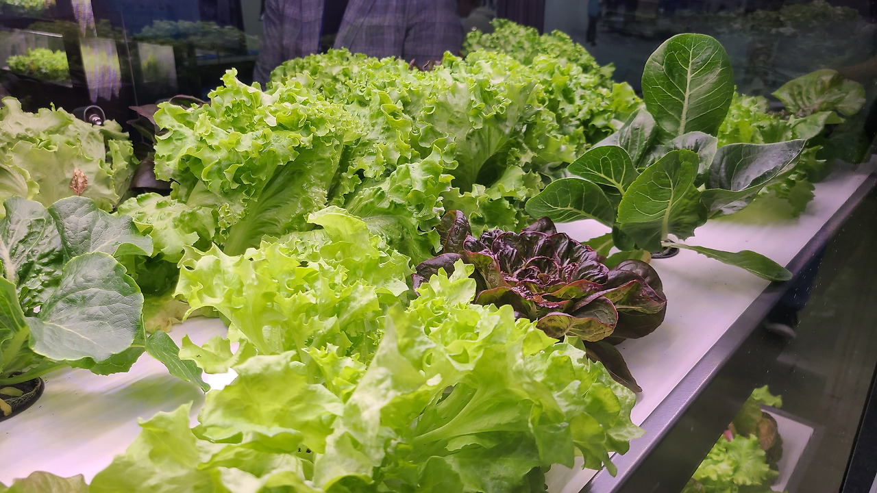 먼저 입구를 들어서자마자 저를 맞이한 것은, 다양한 형태의 스마트팜 설비였습니다. LED 조명과 각종 ICT 기술을 접목시켜 만들어진 스마트팜은 농업에 필수적인 빛과 흙, 물을 대체하거나 효율화하여 최적의 농작물 생육 환경을 만들어내고 있었습니다.