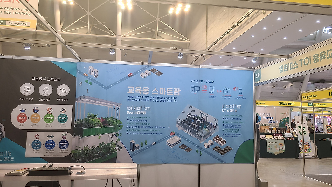 마지막으로 전시관을 오가면서 가장 흥미롭게 봤던 부스는 교육용 스마트팜 솔루션을 소개하는 부스였습니다. 소개 배너 내용처럼 식물에 필요한 빛, 온도, 습도를 관리할 수 있는 서버와 앱을 직접 코딩하여 모니터링할 수 있는 교육용 키트입니다. 특히 저에게는 스마트팜 기술과 교육을 접목시킨다는 점이 매우 신선하게 다가왔습니다.