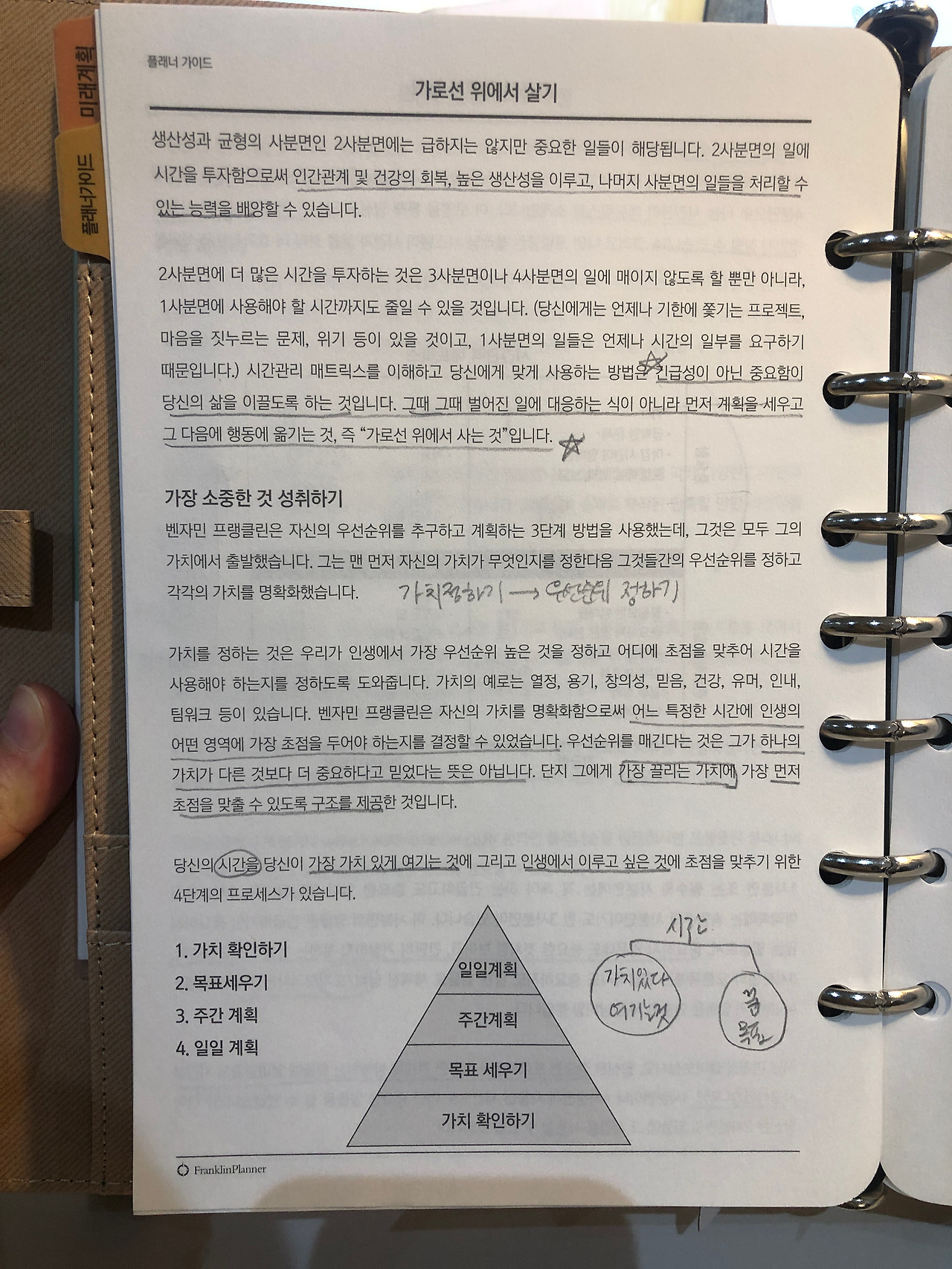 플래너 앞장에는 간단한 소개와 프랭클린 시간관리가 추구하는 것은 무엇인지, 그리고 각 장마다 어떻게 사용해야하는지 나와있습니다. 가치와 사명, 목표, 미래 계획, 재정관리까지 가능하도록요. 전 재정관리까지는 아니더라도 미래 계획, 가치/사명, 목표, 한 주 관리하기 등이 제가 딱 원하는 포맷이었어요. 그래서 무척이나 마음에 듭니다.
