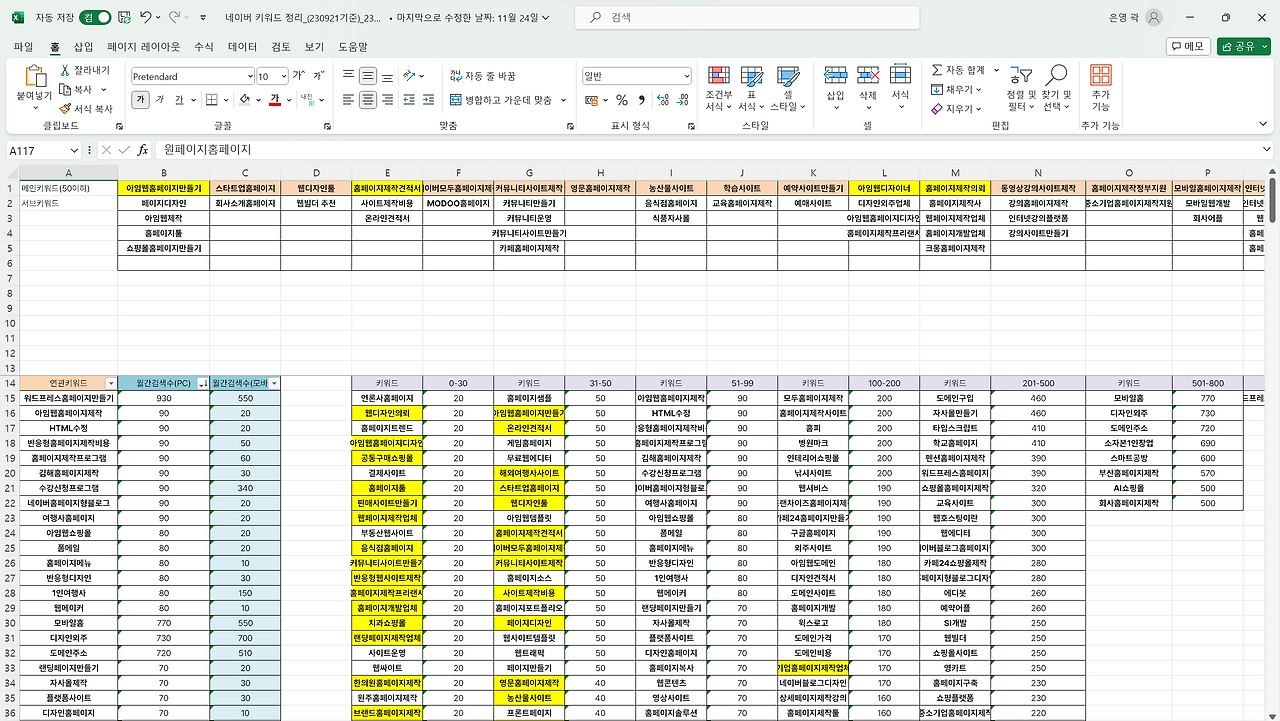 그렇게 셋팅한 키워드들을 분석해서 경쟁이 적은 키워드부터 전략적으로 파고 들었습니다.
