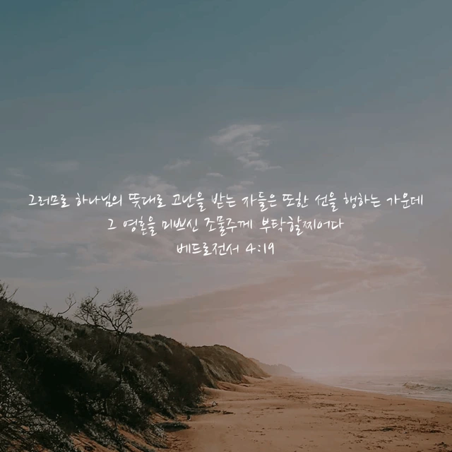그러므로 하나님의 뜻대로 고난을 받는 자들은 또한 선을 행하는 가운데 그 영혼을 미쁘신 조물주께 부탁할지어다_베드로전서 4:19