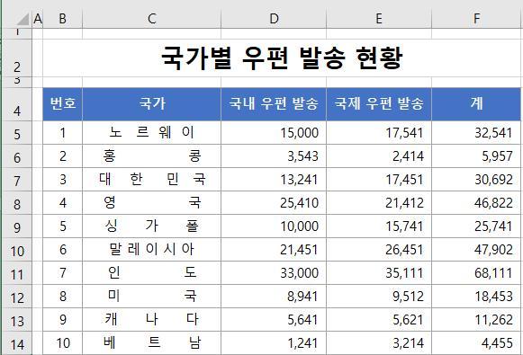 국가명 필드를 ‘균등분할’ 기능을 이용하여 열 너비에 맞게 맞추는 작업을 하겠습니다