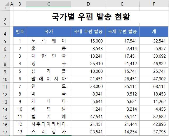 ① 먼저 국가명 필드에 있는 데이터의 공백을 제거하는 방법부터 하겠습니다. 그래야 나중에 균등하게 맞춰집니다. [C5:C20] 영역을 범위로 지정합니다