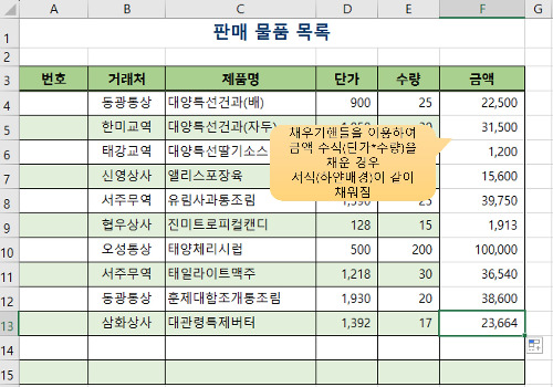 아래 그림처럼 금액 필드에 [D4*E4](단가*수량) 수식을 채우기 핸들로 F13셀까지 드래그해서 수식을 복사하면 수식뿐만 아니라 하얀 배경까지 복사되므로 기존 서식이 없어져버립니다