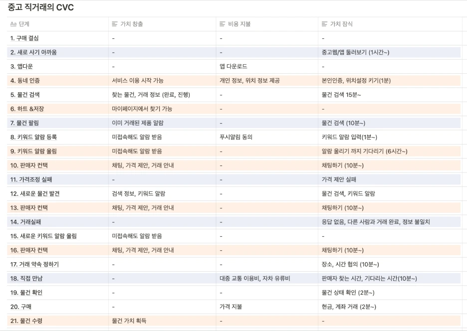 앞선 유저 저니 맵을 통해 고객들이 이 서비스를, 중고 직거래를 어떻게 경험할지 그려보았다. 마지막으로 각 단계별 CVC를 작성해 앞서 발견한 Bad 지점에서 고객이 어떤 가치를 느끼게 되는지를 파악하게 된다면 확실한 Pain Point를 알 수 있을 것이다.