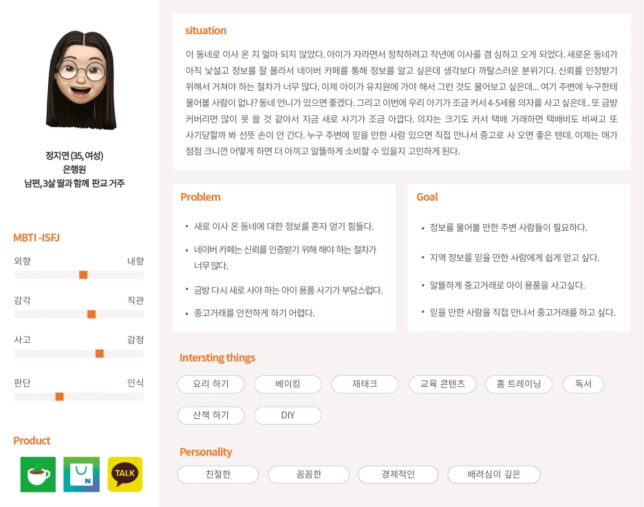 이러한 가설을 바탕으로 '판교장터'에서 확장되는 '당근마켓'의 페르소나를 설정해 보자.