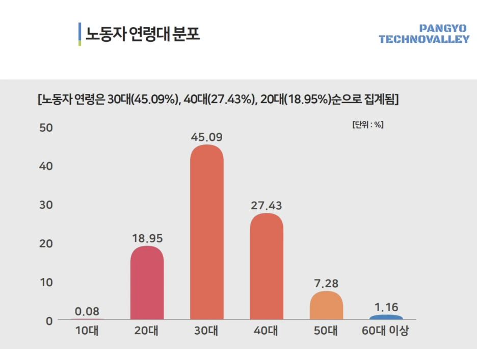 판교 회사를 다니고 있는 사람들을 보면 총 노동자 수 64,497명 중 30대와 40대가 각 45.09%, 27.43% 비율로 가장 높게 분포되어 있음을 확인할 수 있다. '판교장터'는 판교 회사 사람들만이 주 타겟이었기 때문에 이를 이용하는 주 고객층도 30, 40대 연령대임을 확인할 수 있다.