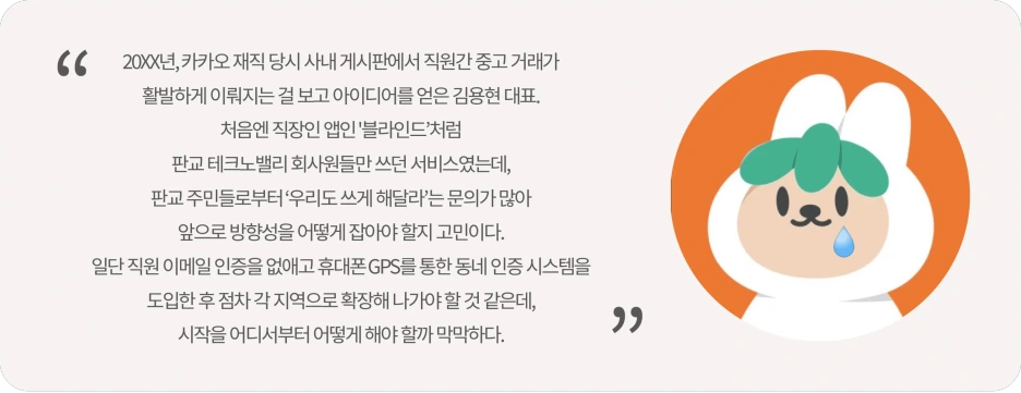 판교는 현재 주로 IT 기업들이 입주해 있으며 여기에는 큰 대기업부터 중소기업까지 입주해있다. 이곳에서 당근마켓이 아니라 원래는 '판교장터'라는 이름으로 판교 회사원들을 대상으로 운영되고 있었다. 판교에 입주한 회사 직원들이 회사 이메일로 인증해 신원을 파악한 후 이용할 수 있는 서비스였고, 판교 내에 근무하고 있는 회사원을 상대로만 운영하는 아주 작은 시장이었다. 하지만 왜 판교 회사원들은 이렇게 복잡한 인증 및 제한적인 제품 종류, 지역적, 사용자 규모에 임에도 불구하고 왜 '판교장터'를 활발하게 이용했을까?