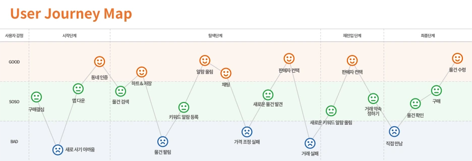 당근마켓에서 중고 직거래를 하는 사람의 과정을 시작 단계 - 탐색 단계 - 재 진입 단계 - 최종 단계 크게 총 4단계로 구분 지어 그려보았다. 고객이 중고 직거래를 하는 과정에 따라 Good - SoSo - Bad로 기분을 나타내었고, 우리는 이 중에서 Bad 지점에 집중해야 한다. Bad 지점에서 고객은 Pain point를 겪게 될 것이고 우리는 그 지점에서 무엇을 해결할지 찾게 된다면 우리가 앞서 세웠던 가설 방향에 맞게 서비스를 개발할 수 있을 것이다.