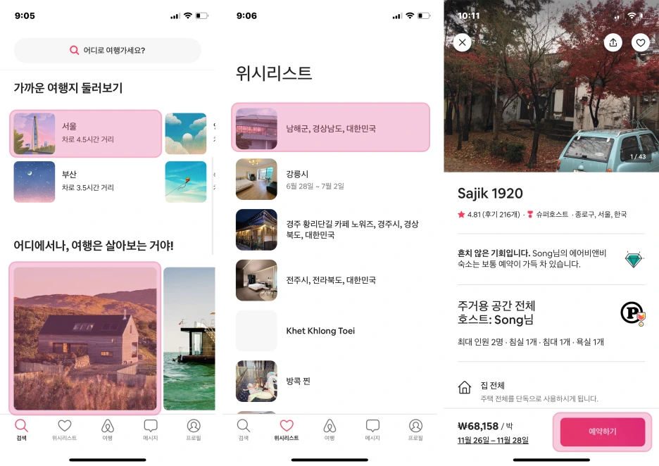 마지막으로 에어비엔비의 CTA인 예약하기 버튼을 피츠의 법칙에 따라 오른쪽 하단에 위치시켰다. 오른손을 주로 쓰는 사용자를 고려한 위치로 한 손으로 핸드폰을 잡아도 쉽게 누를 수 있는 위치이기 때문이다. 또한 흰 여백에 예약하기 버튼에만 색을 주어서 시각적으로 눈에 띄도록 해 고객들이 헤매지 않고 바로 대상에 도달할 수 있도록 했다.