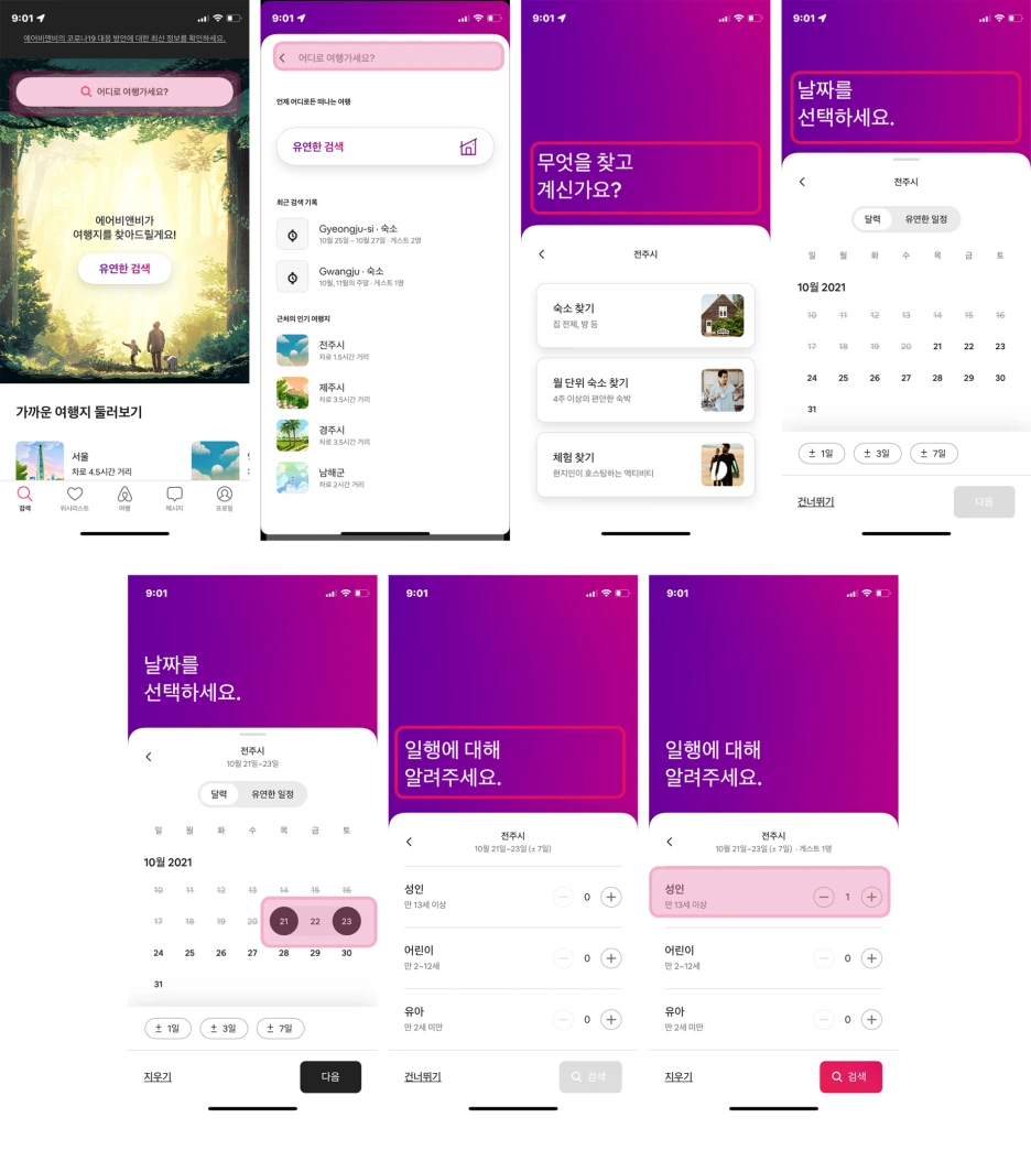 위의 7가지 페이지는 에어비앤비에서 숙소를 고를 때 해야 하는 액션들이다. 에어비앤비는 의사결정 과정을 단계별로 쪼개서 사용자에게 보여주고 있다. 단계별로 순서를 진행하며 동시에 '무엇을 찾고 계시나요?' '날짜를 선택하세요' '일행에 대해 알려주세요'와 같은 문구로 이 페이지에서 무엇을 해야 할지 직관적으로 설명해 주고 있다. 만약 사용자에게 장소, 찾는 종류, 날짜, 일행 이 모든 것을 한 페이지에서 선택하게 했다면 어땠을까? 사용자는 압도적인 선택지에 따라 무엇부터 해야 할지 고민하느라 시간이 흘러갈 것이다. 에어비앤비는 힉의 법칙에 따라 의사결정 과정을 나눠서 보여줌으로써, 사용자에게 한 화면에서 보이는 선택지의 개수를 줄여줘 핵심을 간결하게 전달하고 있다.
