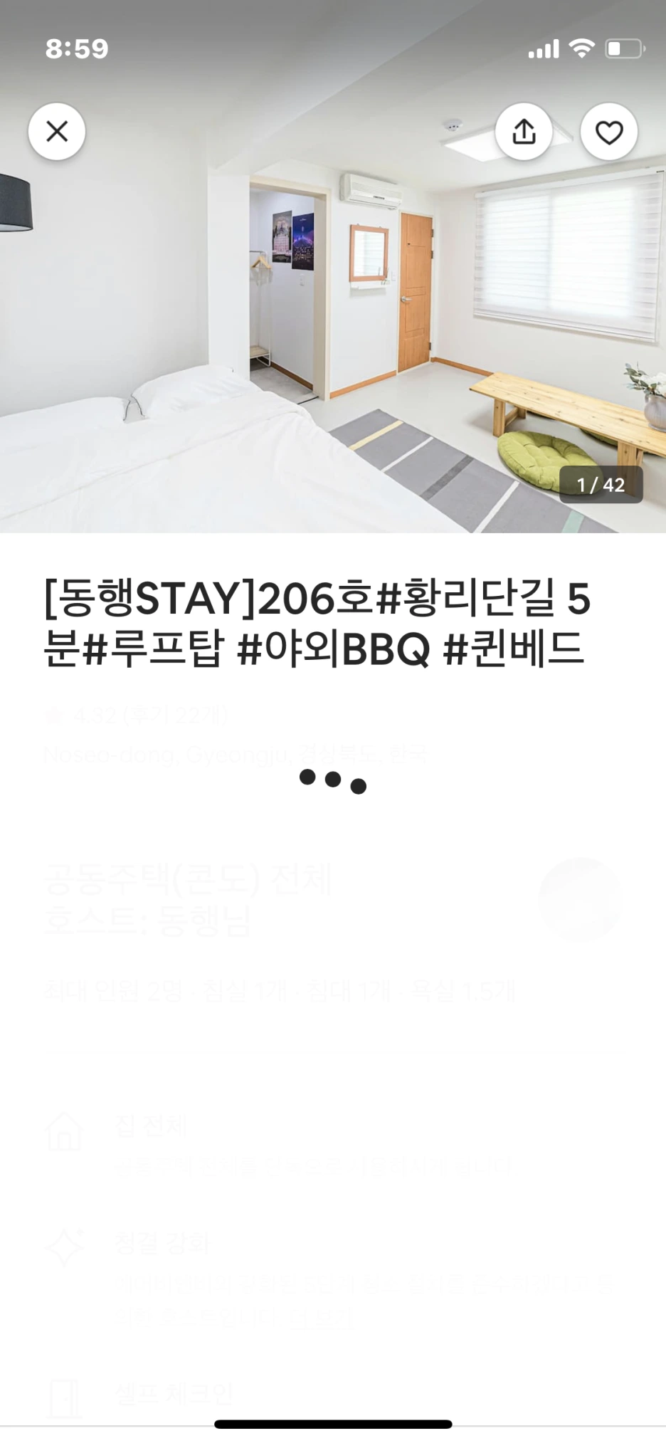 에어비앤비도 도허티 임계 법칙에 따라 로딩 중 일 경우 세 개의 점이 파도치듯 흐르는듯한 이미지를 보여주어 곳 무언가 나오고 있다는 암시를 표현해 주고 있다. 아무래도 하나의 숙소를 클릭할 때 이미지부터 많은 양의 글을 불러와야 하기 때문에 사용자의 인터넷 환경에 따라서 로딩 속도에 차이가 있을 것이다. 사용자에게 숙소 클릭 후 흰 화면만 보여준다면 렉이 걸린 줄 알고 바로 화면을 나가게 되지만, 이런 화면을 보여주면 곧 무언가가 나올 것 같다는 기대감에 대기하게 된다.