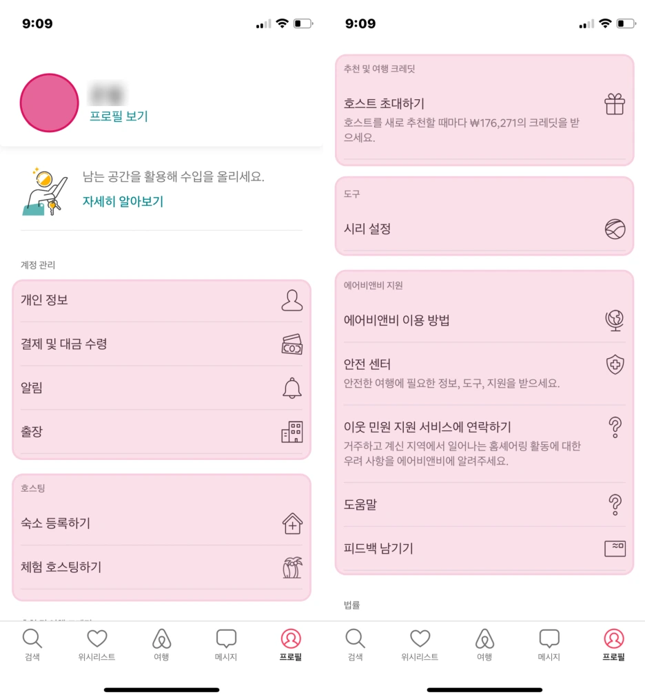에어비앤비는 밀러의 법칙에 따라 한 화면에 보이는 내용들을 그룹화해서 보여주고 있다. 숙소 플랫폼은 결제부터 환불, 안전 등 다양하고 복잡한 서비스들이 제공된다. 에어비앤비 프로필에 들어가면 이러한 내용들이 쭉 나열돼 있는데 에어비엔비는 이들을 계정관리, 호스팅, 도구, 에어비엔비 지원, 법률 등으로 그룹핑해 덩어리로 보여주고 있다. 프로필에 있는 서비스들은 사람들에게 꼭 필요하고 언젠가 꼭 찾게 될 서비스이다. 그만큼 프로필 영역에 들어왔을 때 많은 항목들로 헷갈리지 않도록 큰 5가지 항목들을 덩어리로 확인하면서 소비자가 쉽게 기억할 수 있도록 했다.